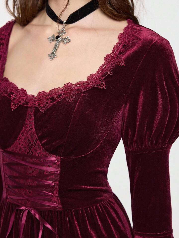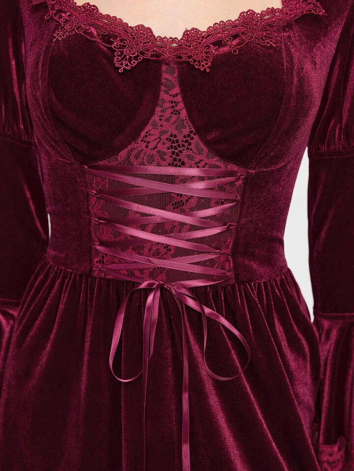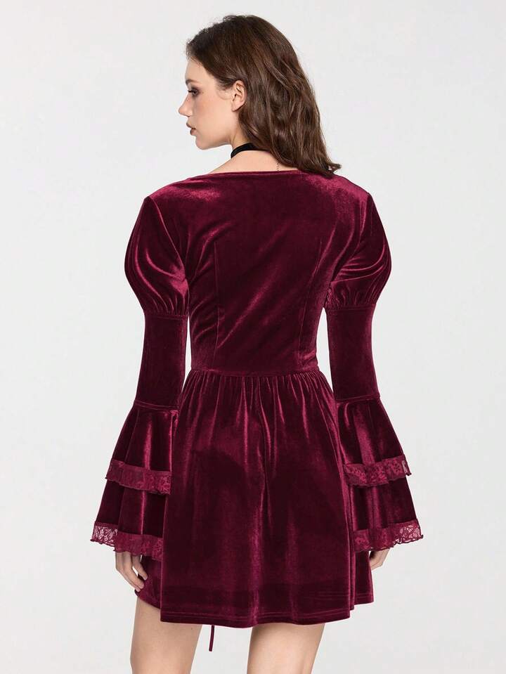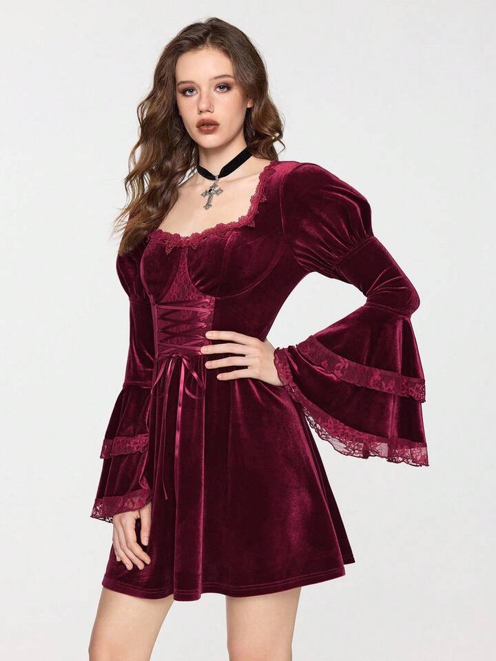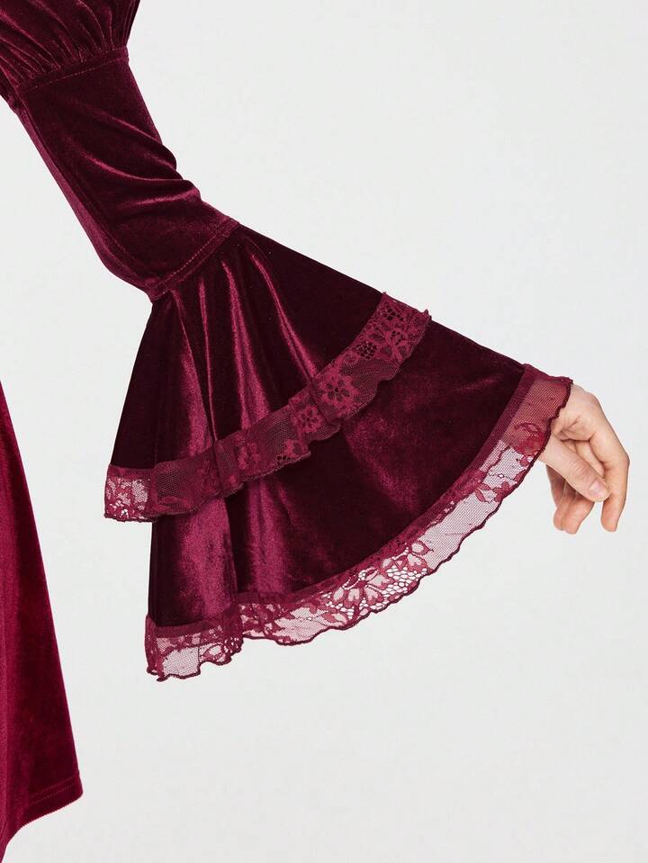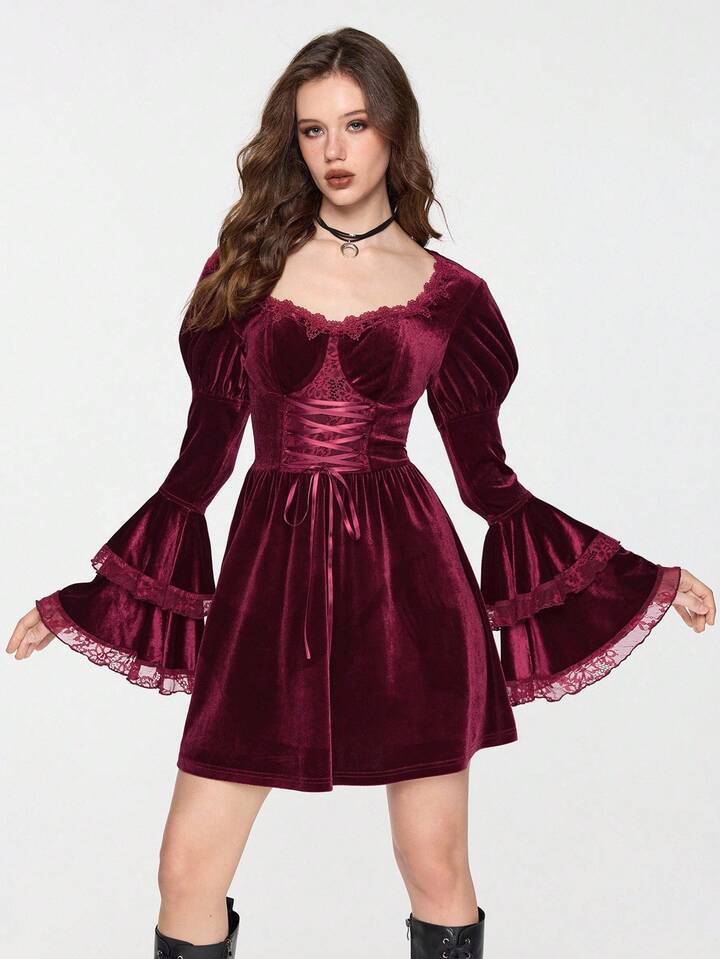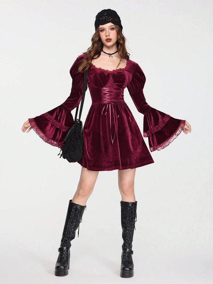 EDITION Halloween Hexe Samt Mysteriöses Glockenärmel Schnürung Taille Midi Kleid für Frauen