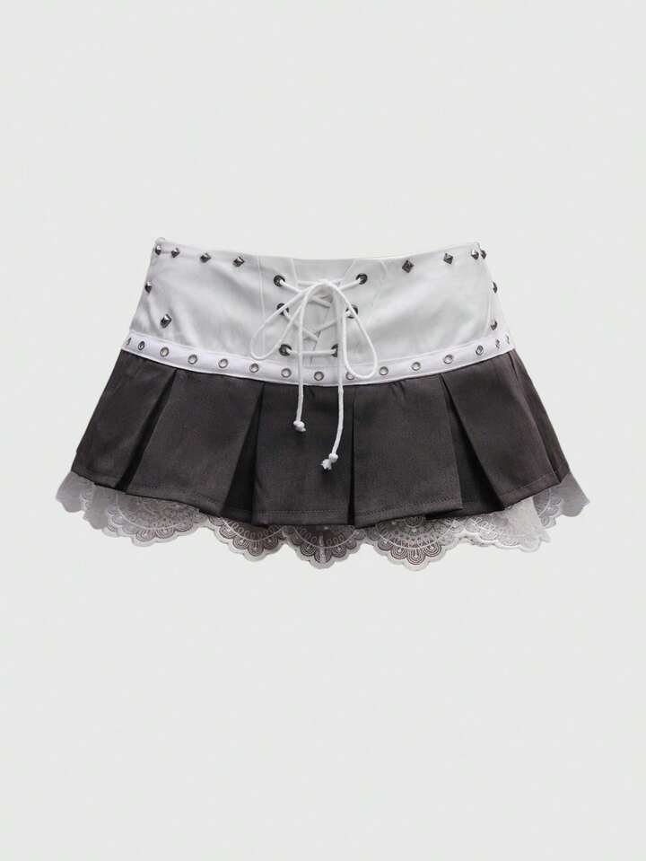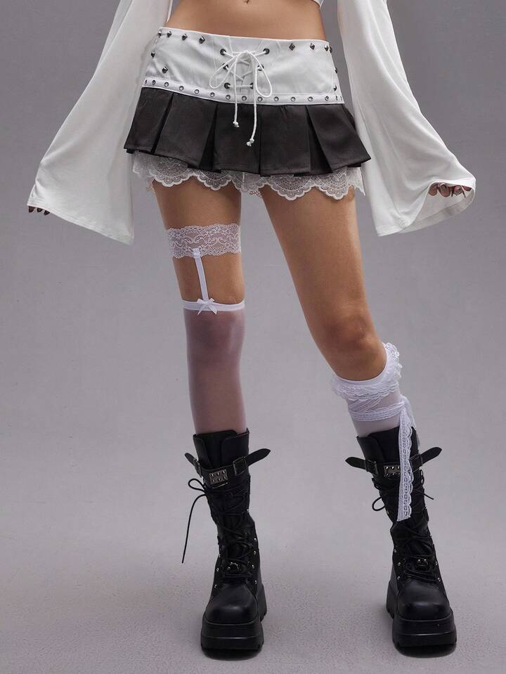 EDITION Romantischer Punk Spitze Patchwork Nieten Design Mini Plissee Rock