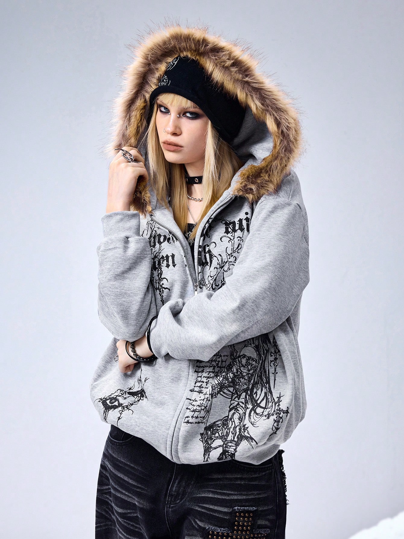 EDITION Y3K Cyber Sigilismus Muster Patchwork Kunstpelzkragen Loose Fit Sweatshirt für Frauen