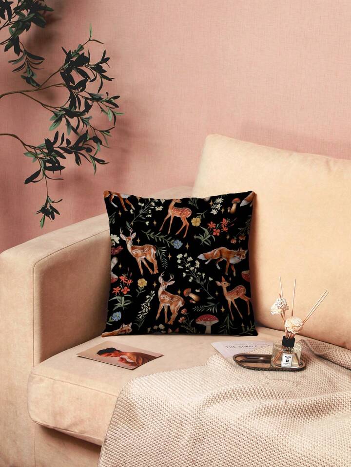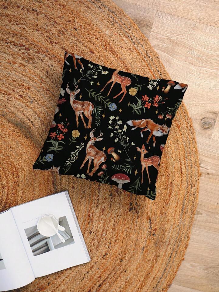 Fairycore 1 Stück handgezeichneter, süßer Hirsch & Blumen Muster Kissenbezug, bedruckter quadratischer Samtbezug, geeignet für Wohnzimmer, Schlafzimmer, Heimdekoration, Sofa, Auto, ganzjährig