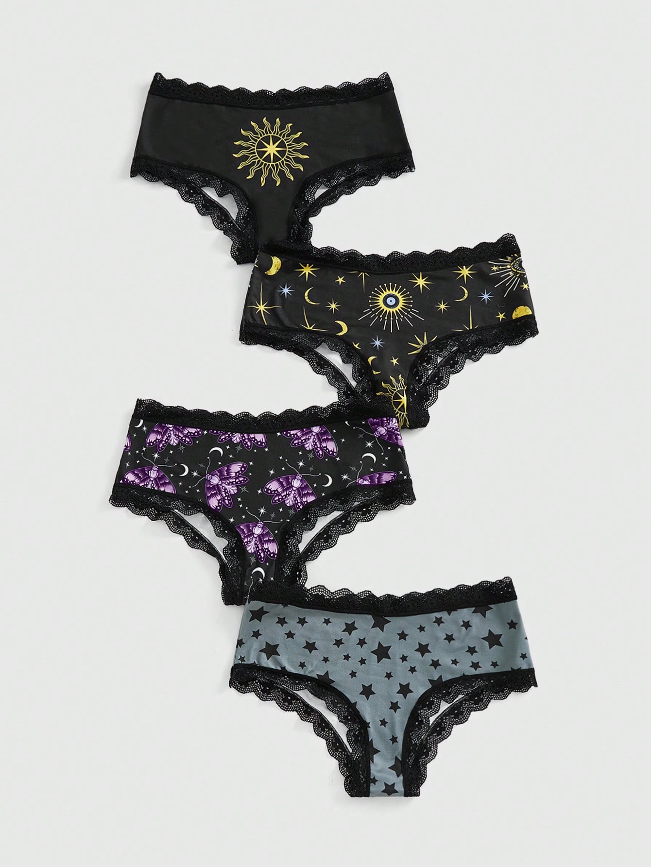 Fairycore 4 Stücke/Set Hippiestil Sonne, Mond, Stern & Motte Muster Spitzeneinsatz Unterhose