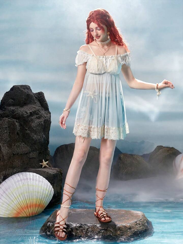 Fairycore Cami Kontrast Spitzen, transparentem Netz, Negligee mit