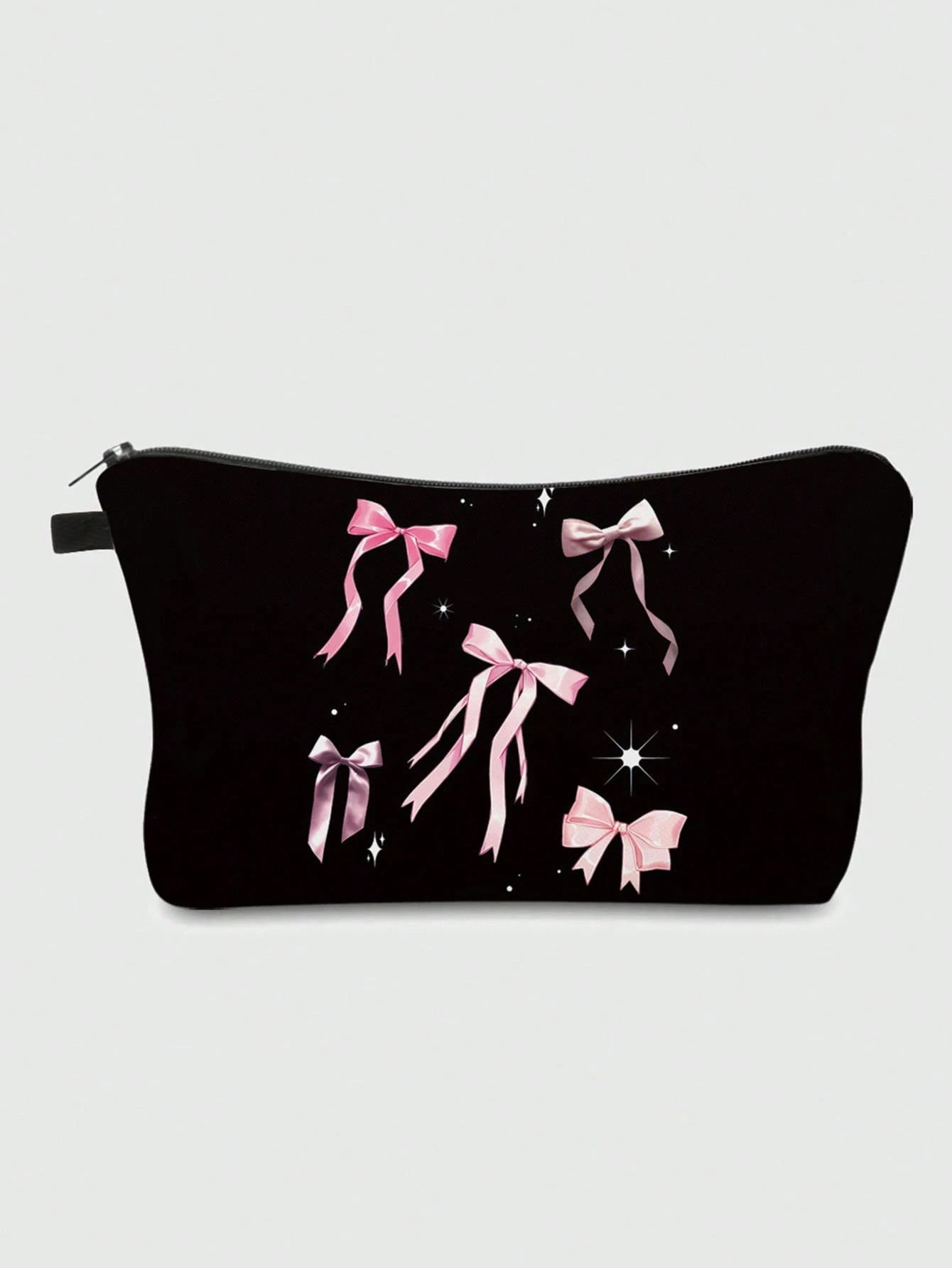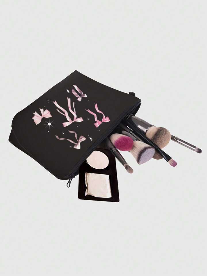 Fairycore Blumendesign Nr. 736722 schwarze Basis rosa Schleifen-Muster Polyester Reißverschluss Kosmetiktasche, Damen Make-up Reise-Organizer Kulturtasche, Urlaubsgeschenk
