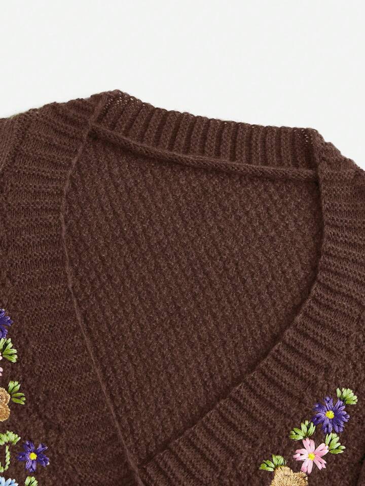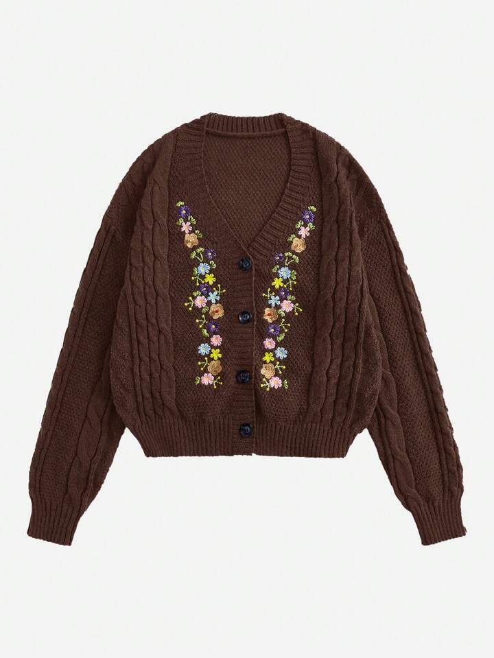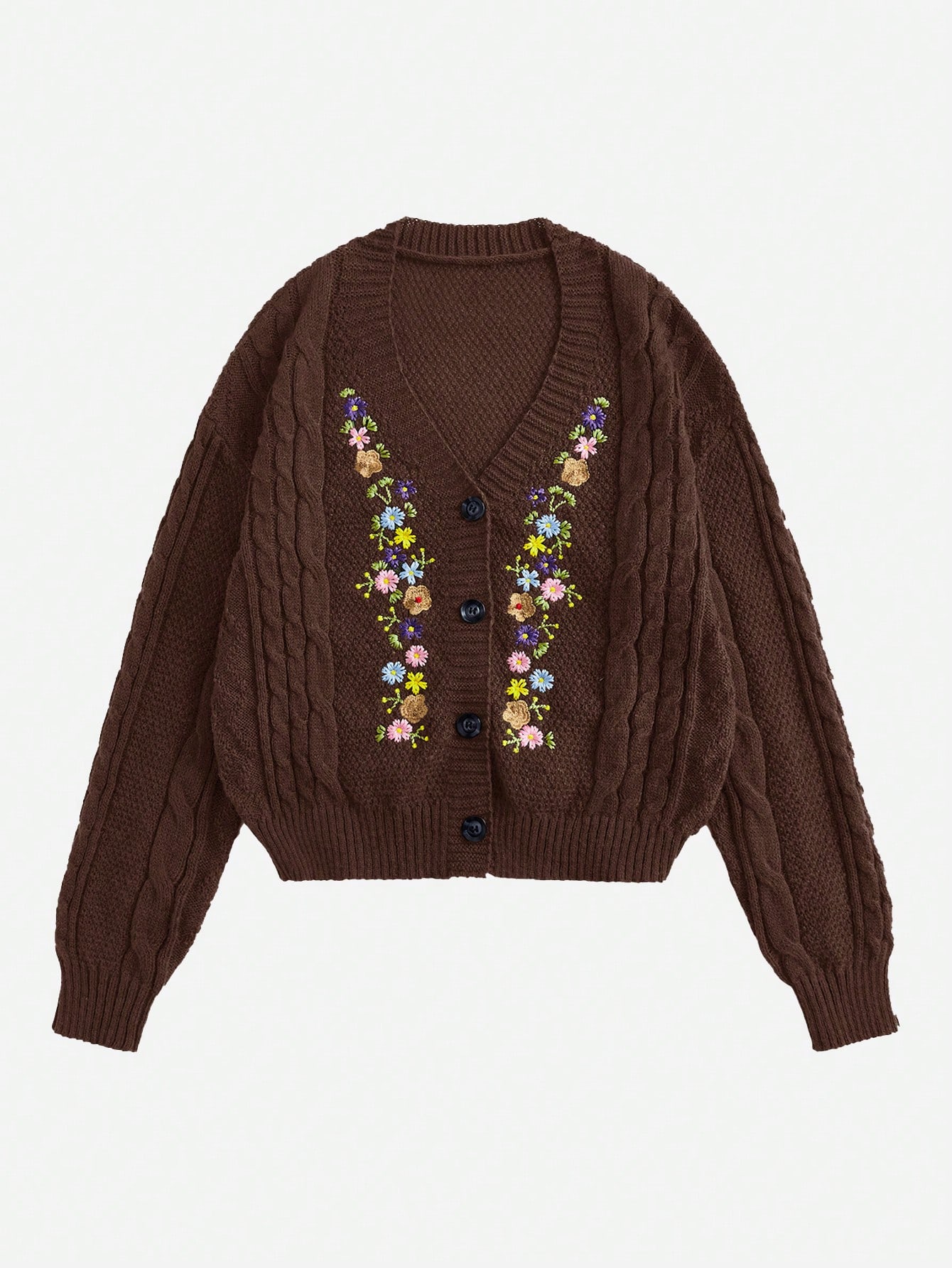 Fairycore Cardigan mit Blume Stickerei, Zopfstrick Knopf vorne