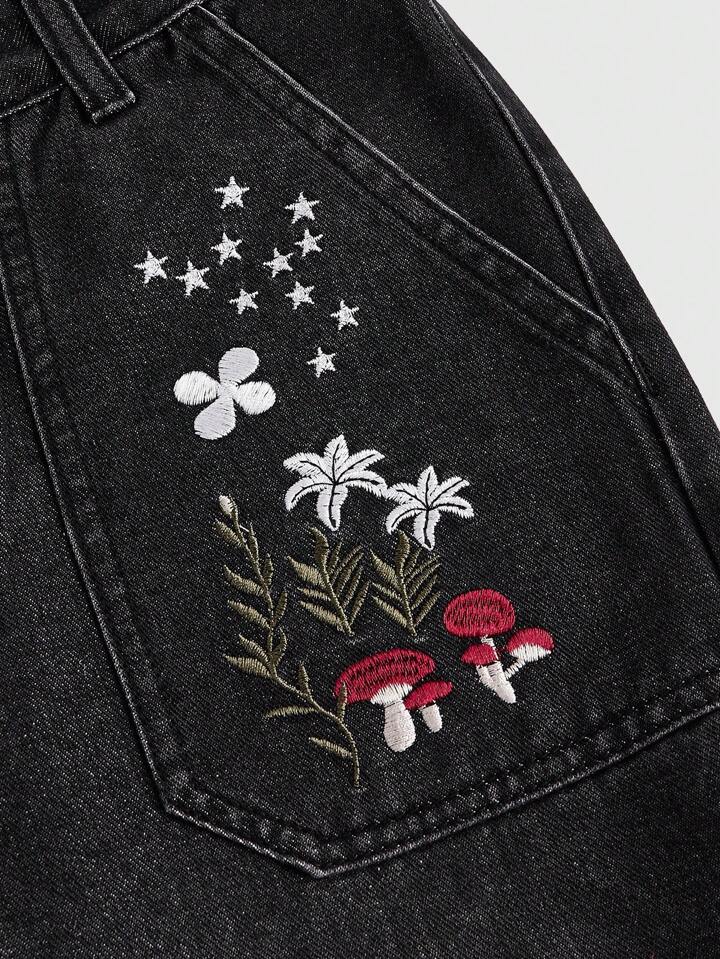 Fairycore Jeans mit Blume & Pilz Stickerei, Lose breitem Beinschnitt,