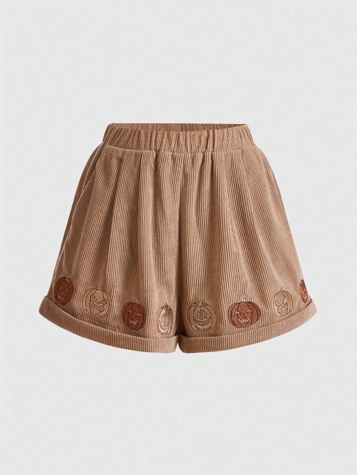 Fairycore Shorts mit Halloween Kürbis Stickerei, Kord