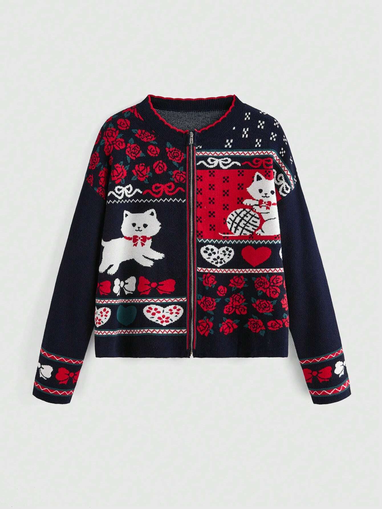 Fairycore Herzchen, Schleifen & Blumen Muster leichte Reißverschluss Strickjacke für Damen, Herbst/Winter