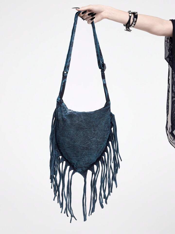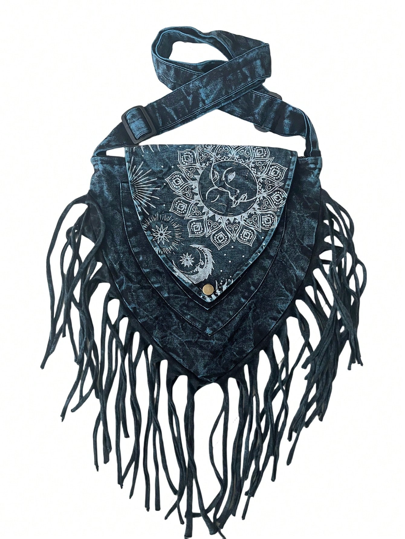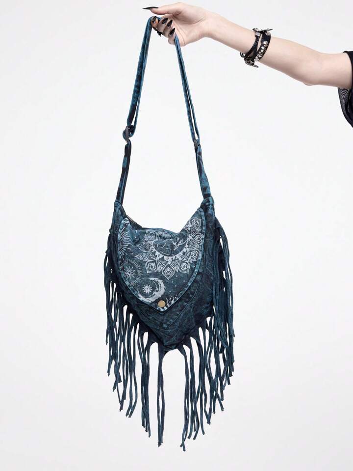 Fairycore Hippie Apokalypse Boho Mond & Sonne Muster Quasten Umhängetasche, Musik Festival Wanderlust Streetwear handgemachte zufällige Muster gefärbte Umhängetasche