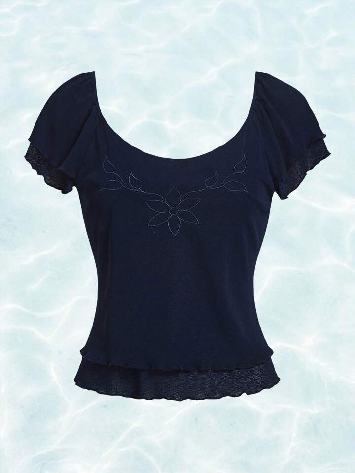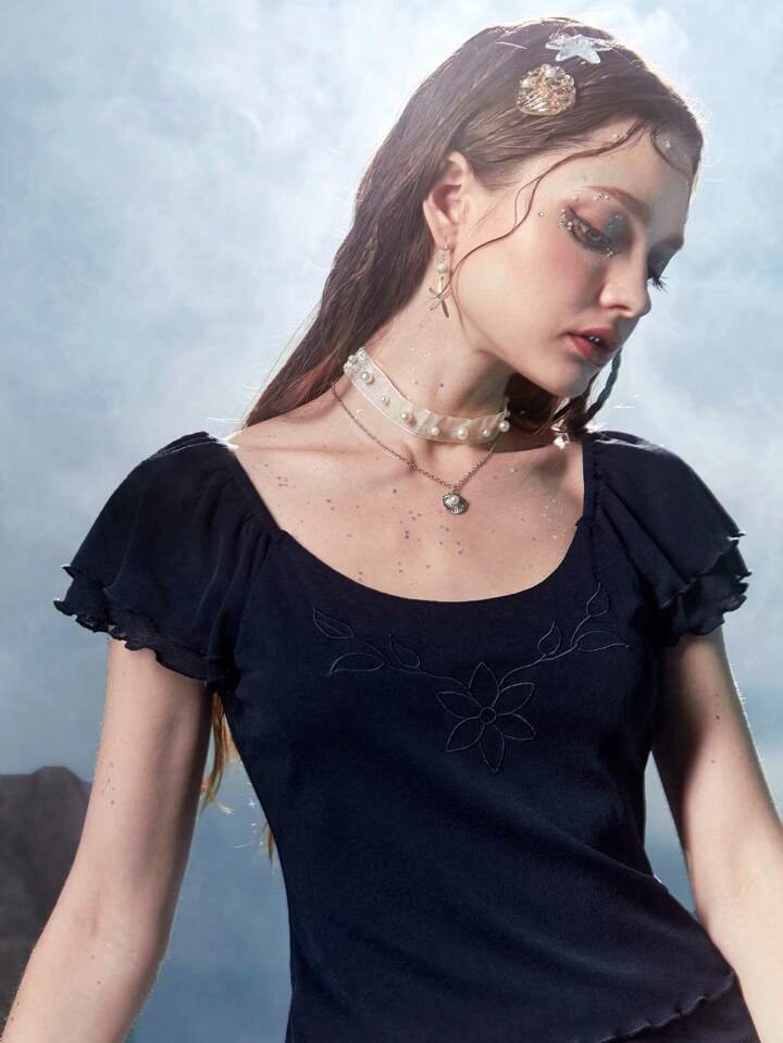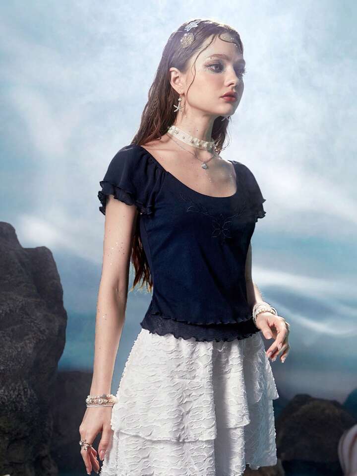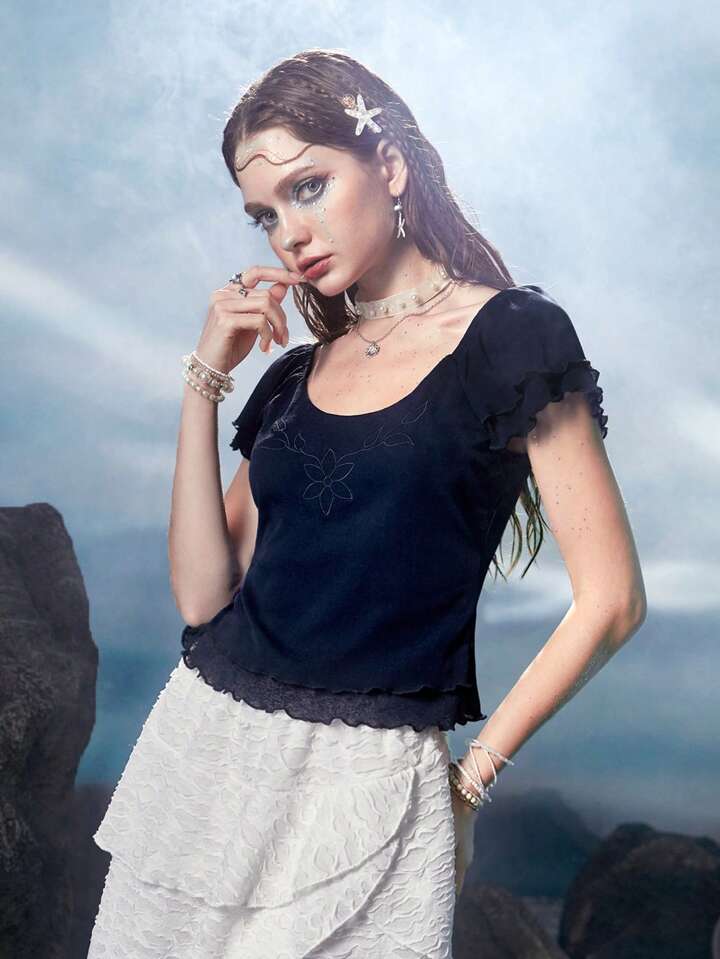 Fairycore Meerjungfrau Top mit Blume Stickerei, Wellensaum