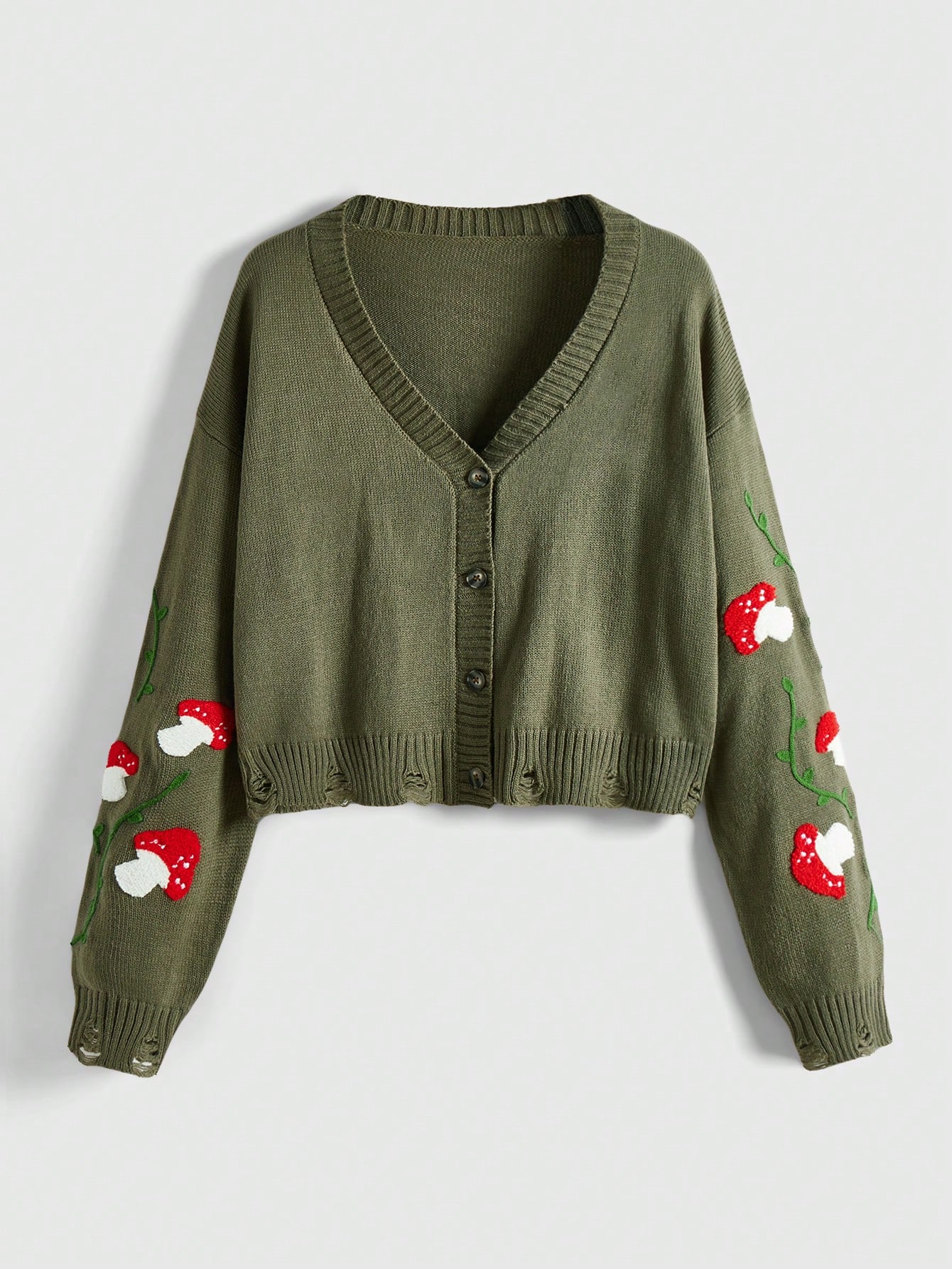 Fairycore Strickjacke mit Pilzstickerei und Knopfleiste vorne