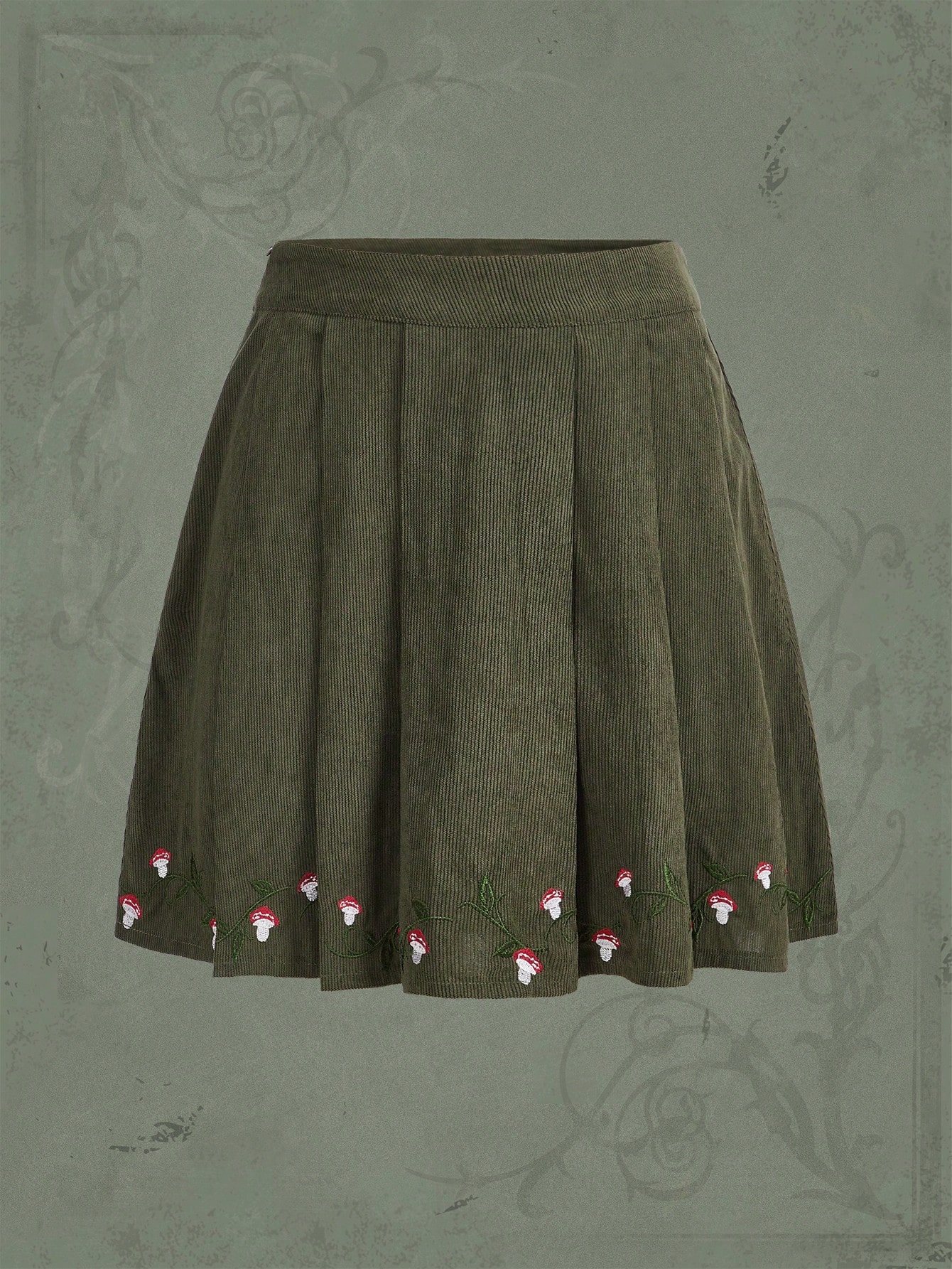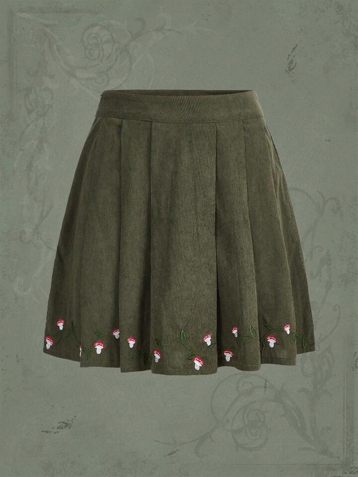 Fairycore Faltenrock mit Pilz Stickerei, Kord