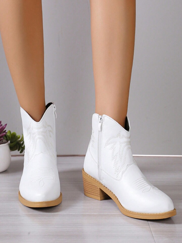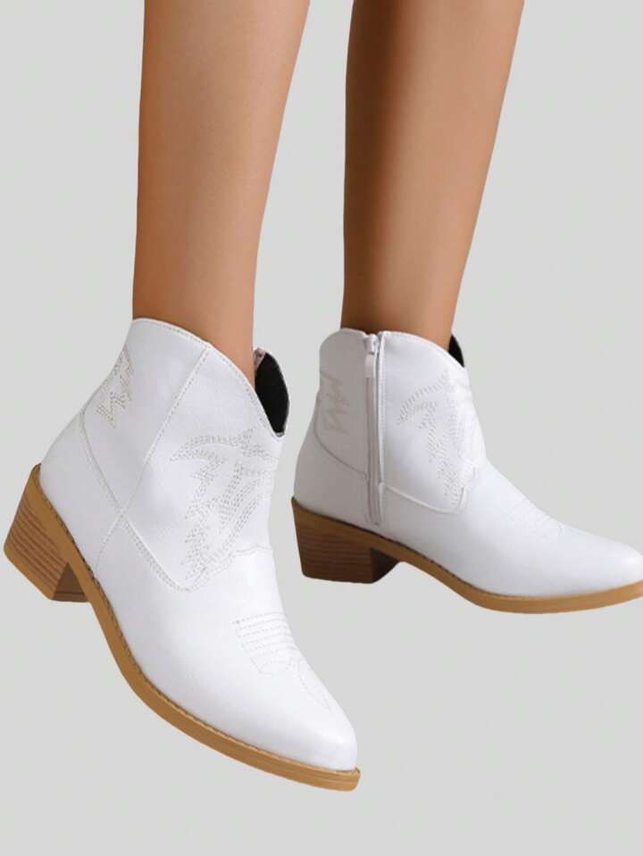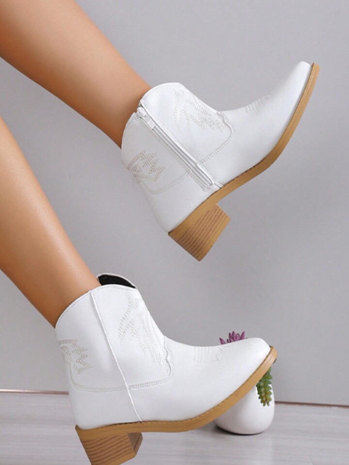 Fairycore Neue Frühlings- und Herbststil weiße Western Stiefel Frauen Niedrig Retro Quadrat Zeh Cowboy Stiefel mit Stickerei Dekor