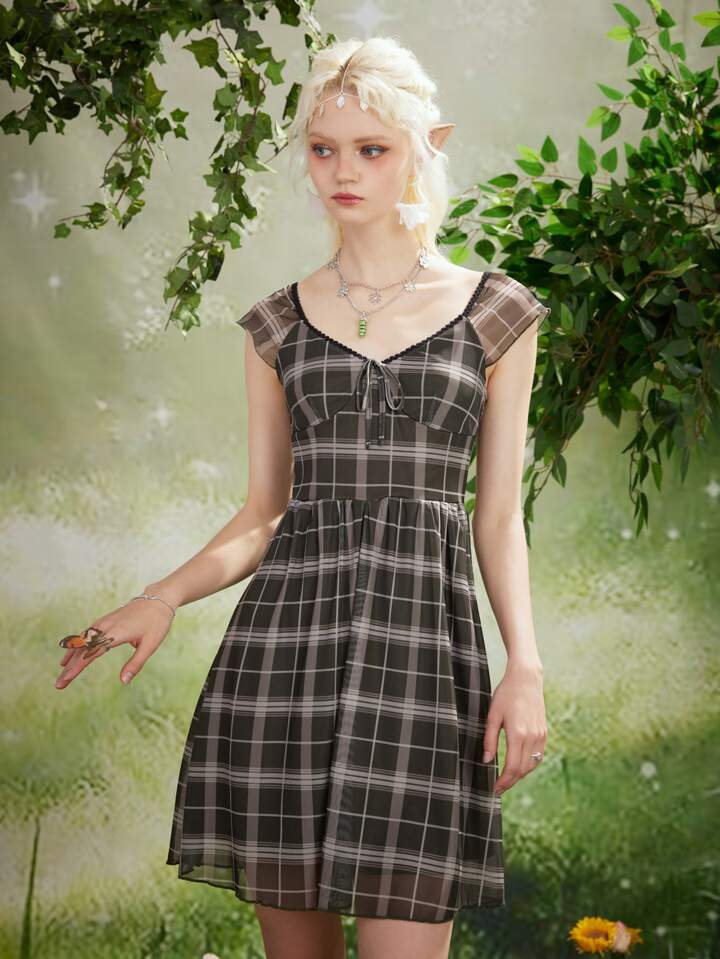 Fairycore Kleid mit Plaid Muster, Flügelärmeln
