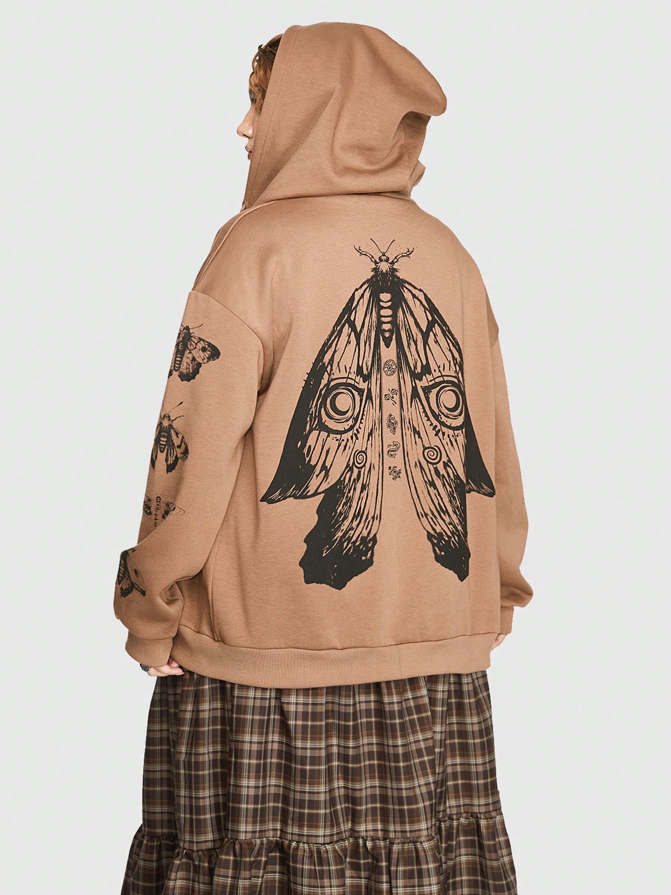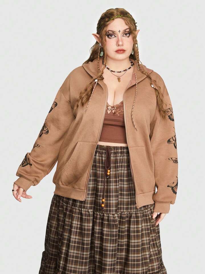 Fairycore Große Größe Hoodie mit Schmetterling Muster, Drop Shoulder Tunnelzug,