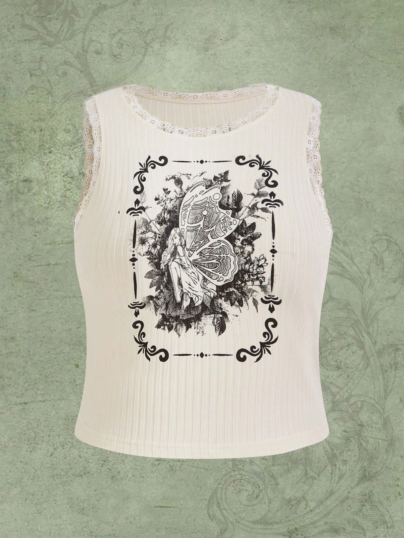 Fairycore Tank Top mit Schmetterling Muster, Spitzenbesatz,