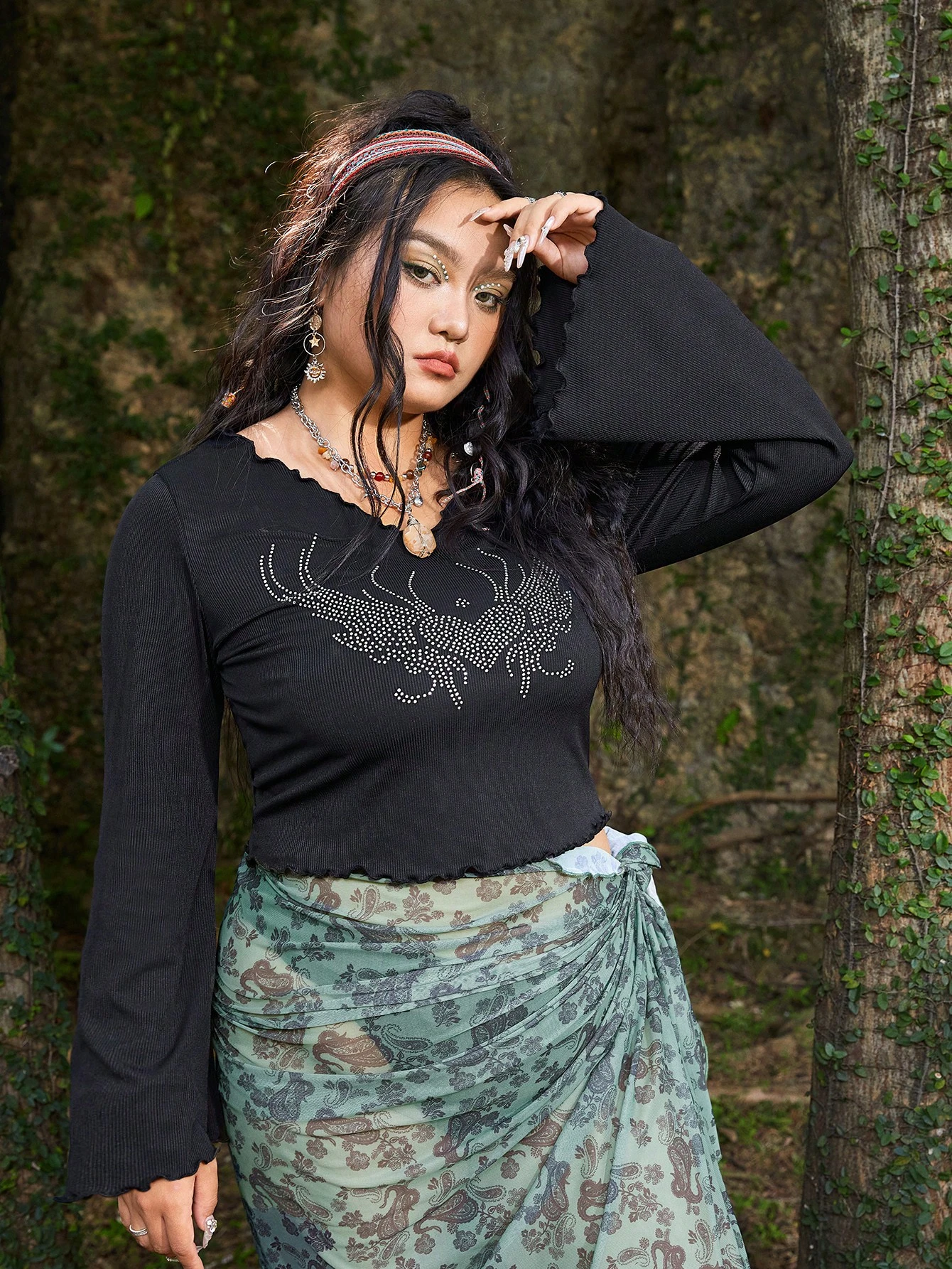 Fairycore T-Shirt mit Strass, Herz Muster, Wellensaum,