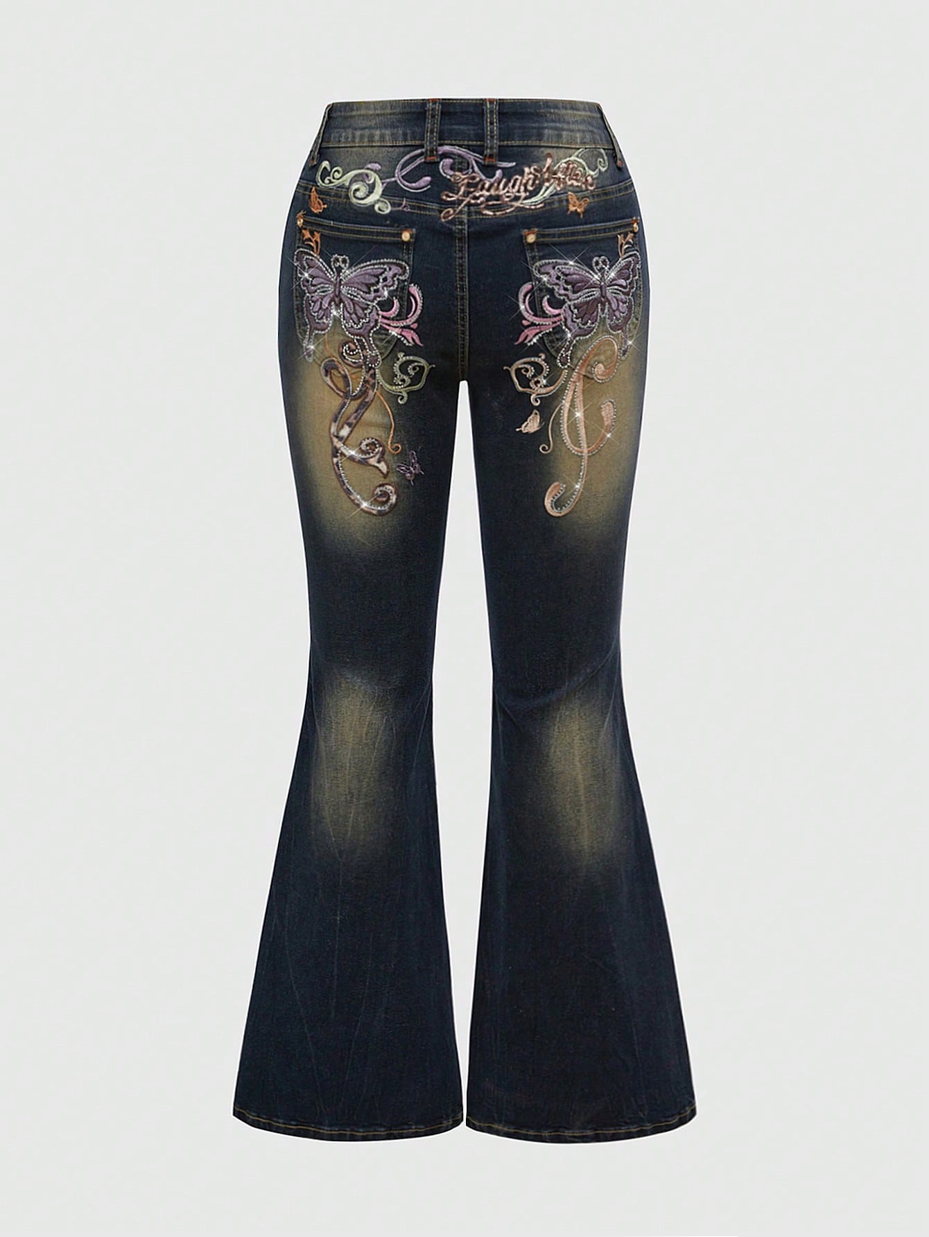 Fairycore Große Größen "Lache oft" Englischer Text & Leoparden Schleifen Design Vintage Jeans