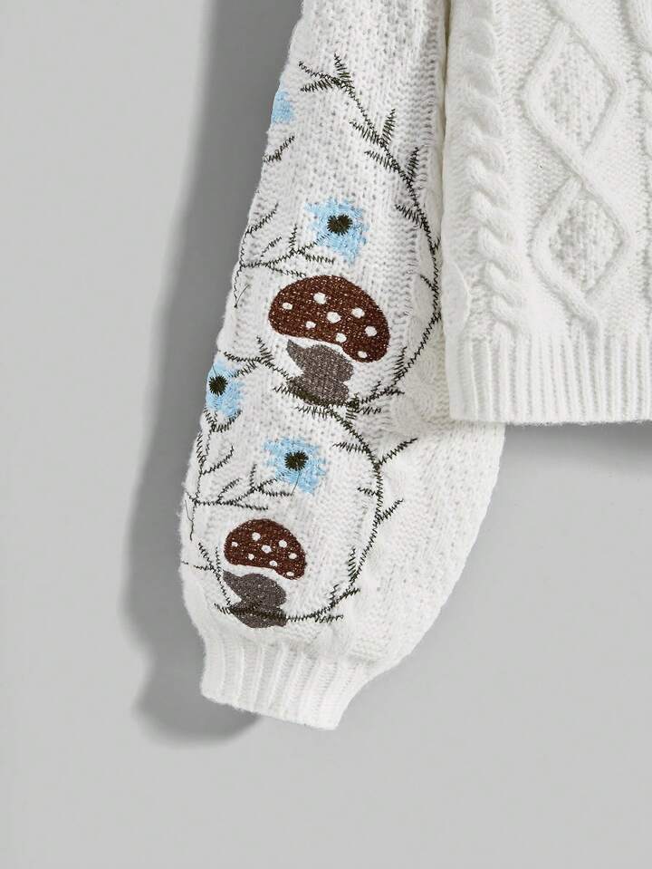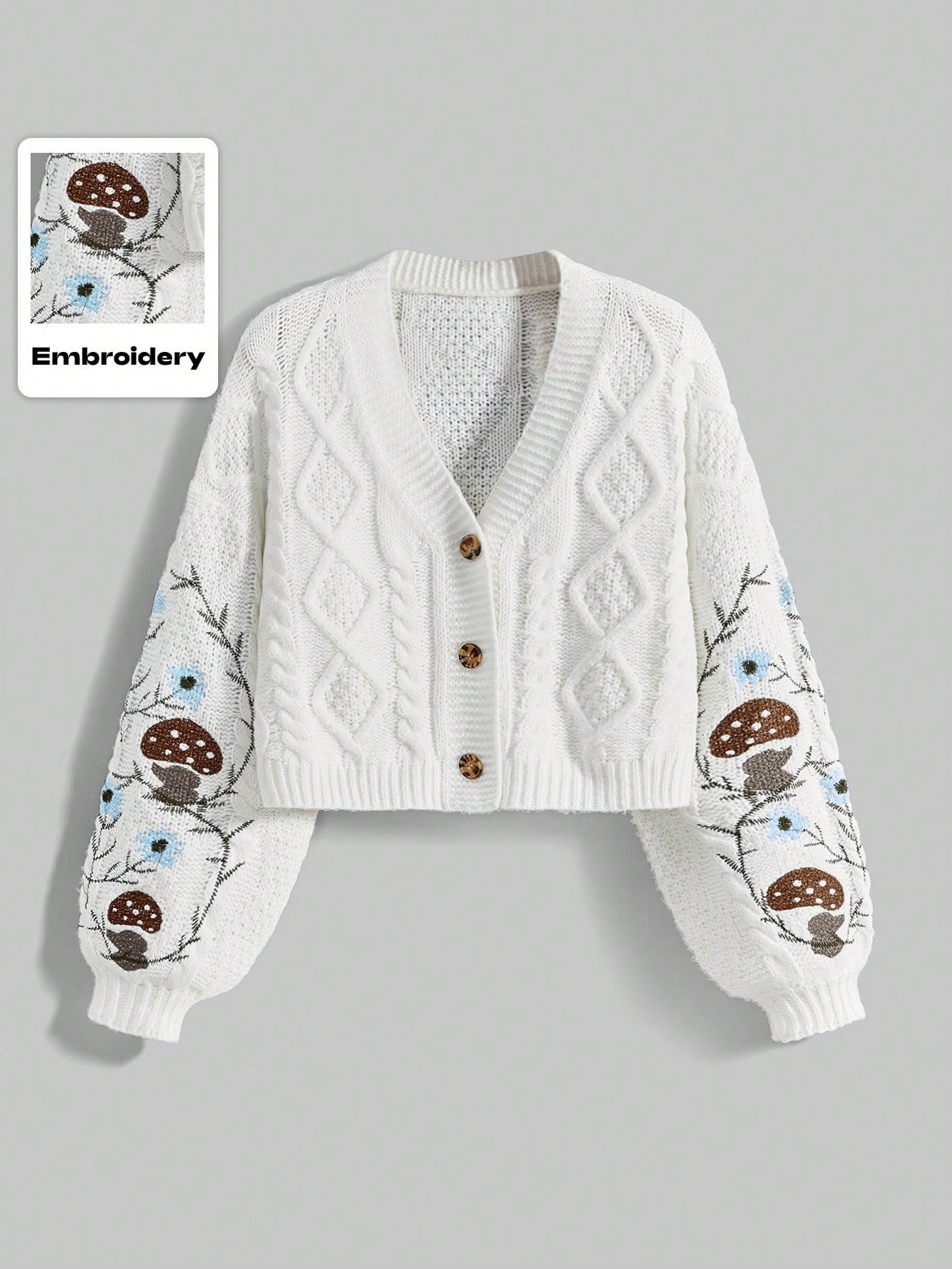 Fairycore Große Größen Pilz, Rebe & Blatt bestickte Strickjacke, Herbst/Winter Mori Mädchen elegante Große Größen Damen Strickjacke, Große Größen Damen Herbst/Winter Strickjacke Oberbekleidung, weiße Strickjacke