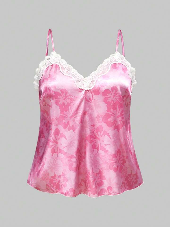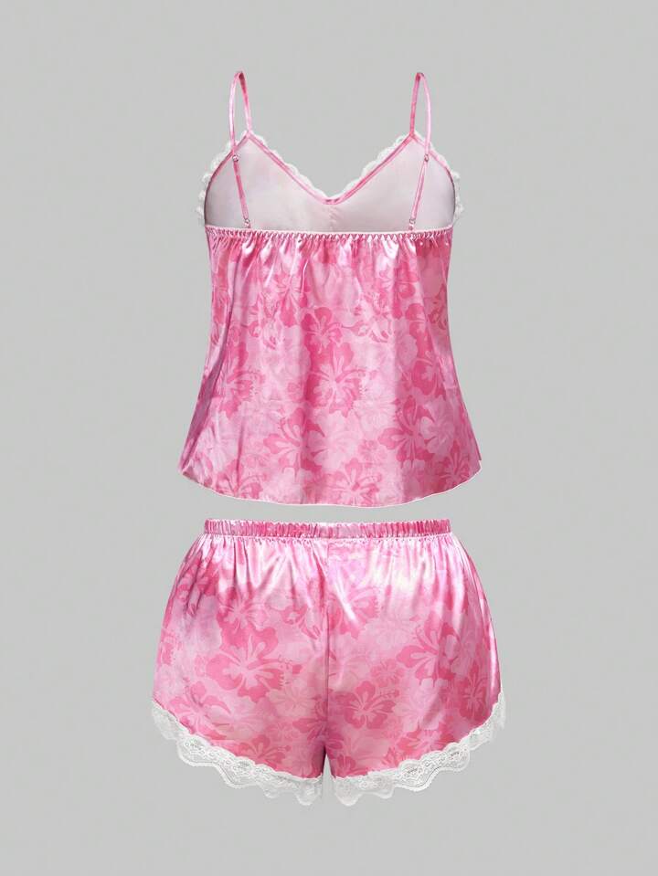 Fairycore Große Größen Tropisch Hibiskus Blumen Allover-Muster Spitzen & Satin Träger-Oberteil Lässig Pyjama-Set für den Sommer