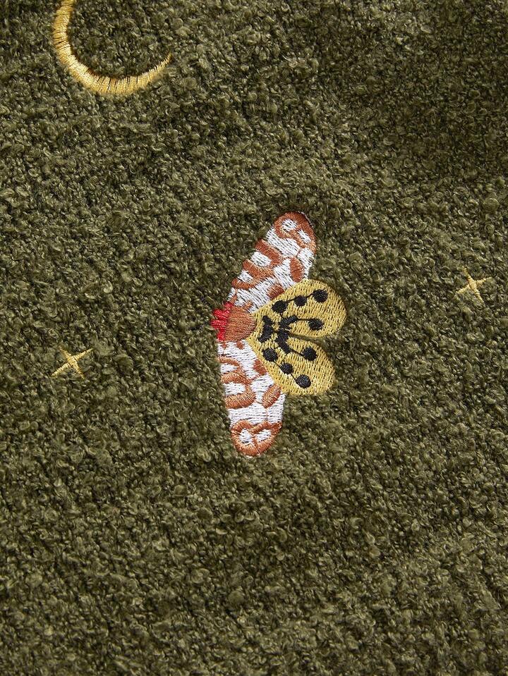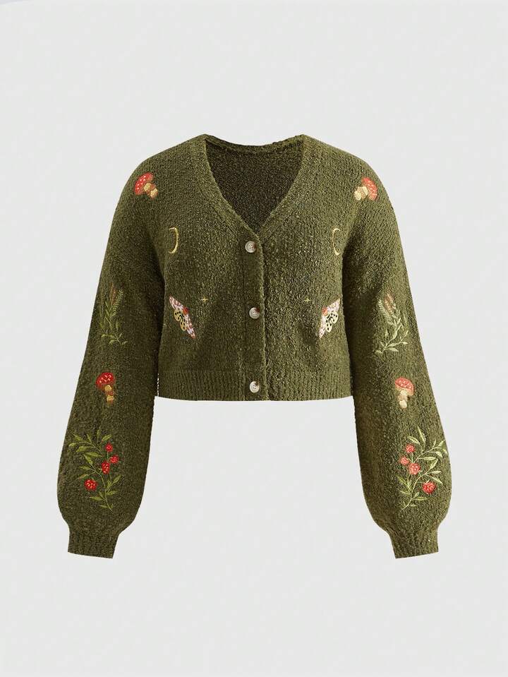 Fairycore Damen Große Größen Pilz Stickerei Drop-Shoulder Langarm Lässig Strick Cardigan, Herbst/Winter