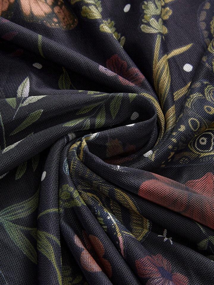 Fairycore Damen Große Größen A-Linien Mesh Rock mit Blumen- und Pflanzenprint, inspiriert von der Natur