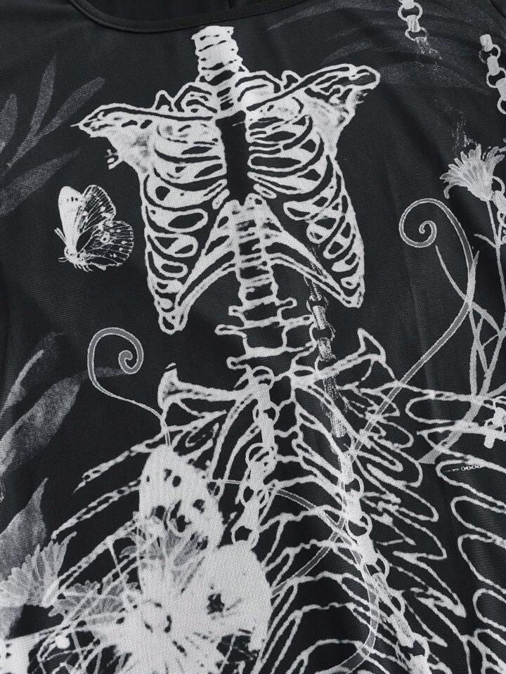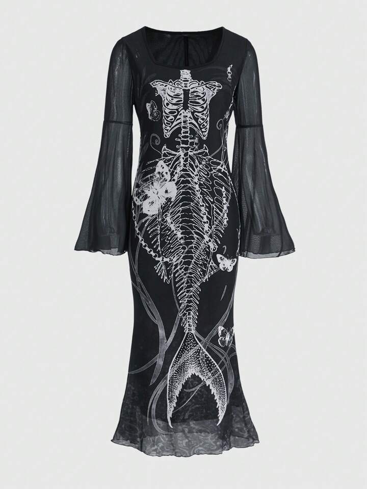 Fairycore Kleid mit Skelett Muster, Trompetenärmeln, Meerjungfrau Saum, Mesh