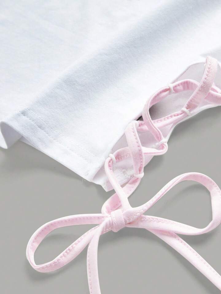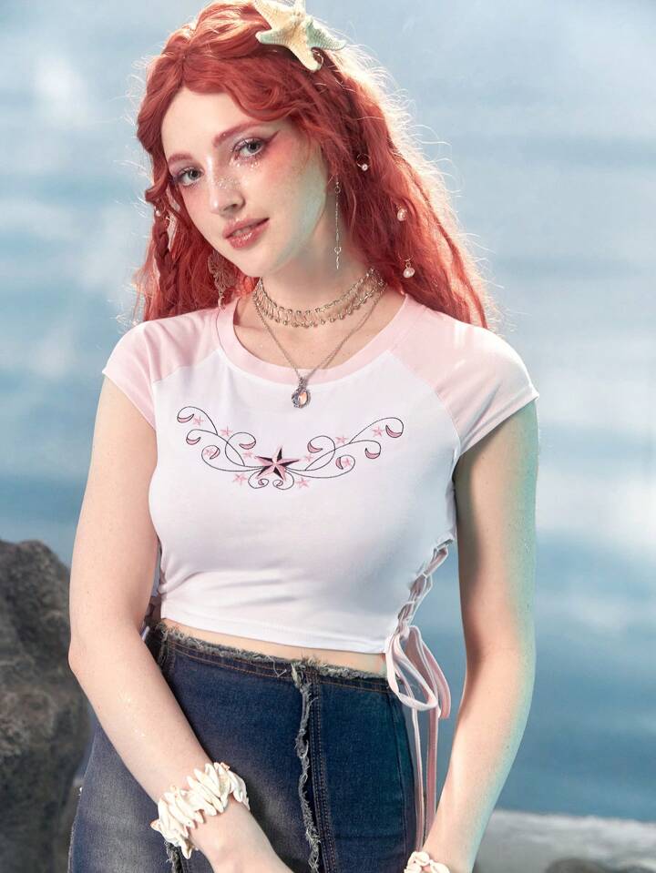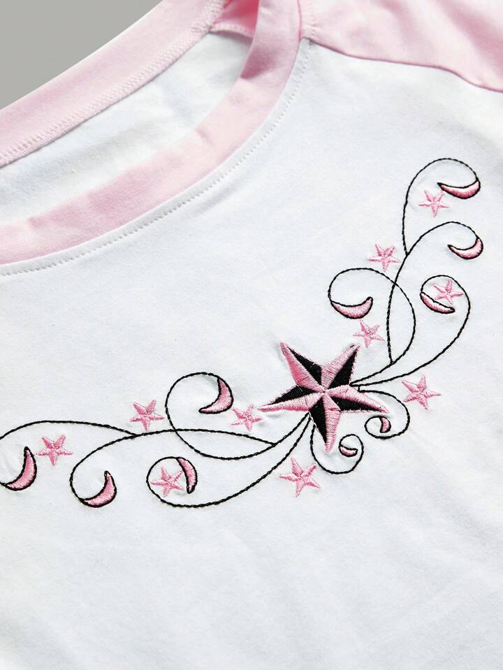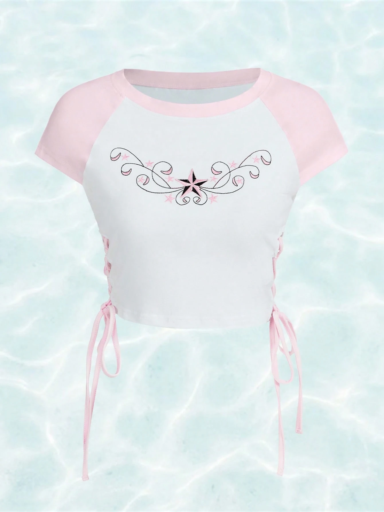 Fairycore Crop T-Shirt mit Stern Stickerei, seitlichem Band, Raglanärmeln,