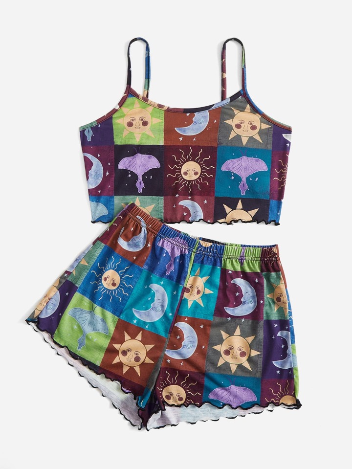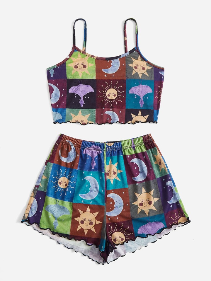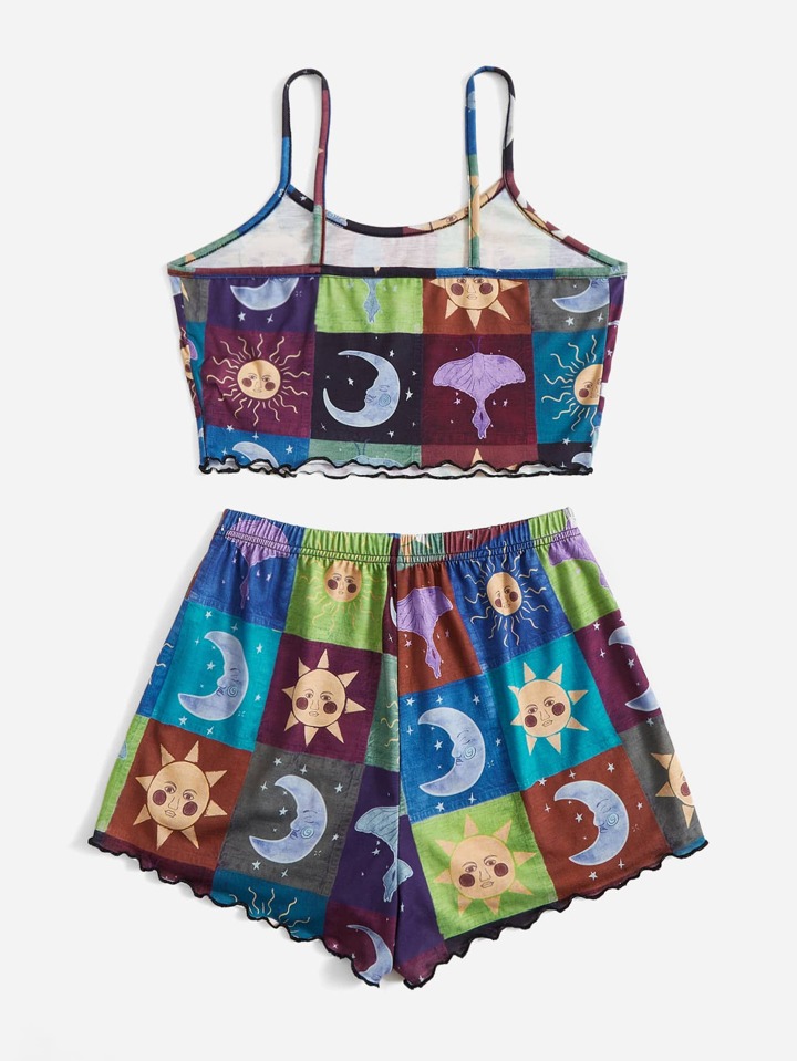 Fairycore Pyjama Set mit Sonne & Mond Grafik Wellensaum