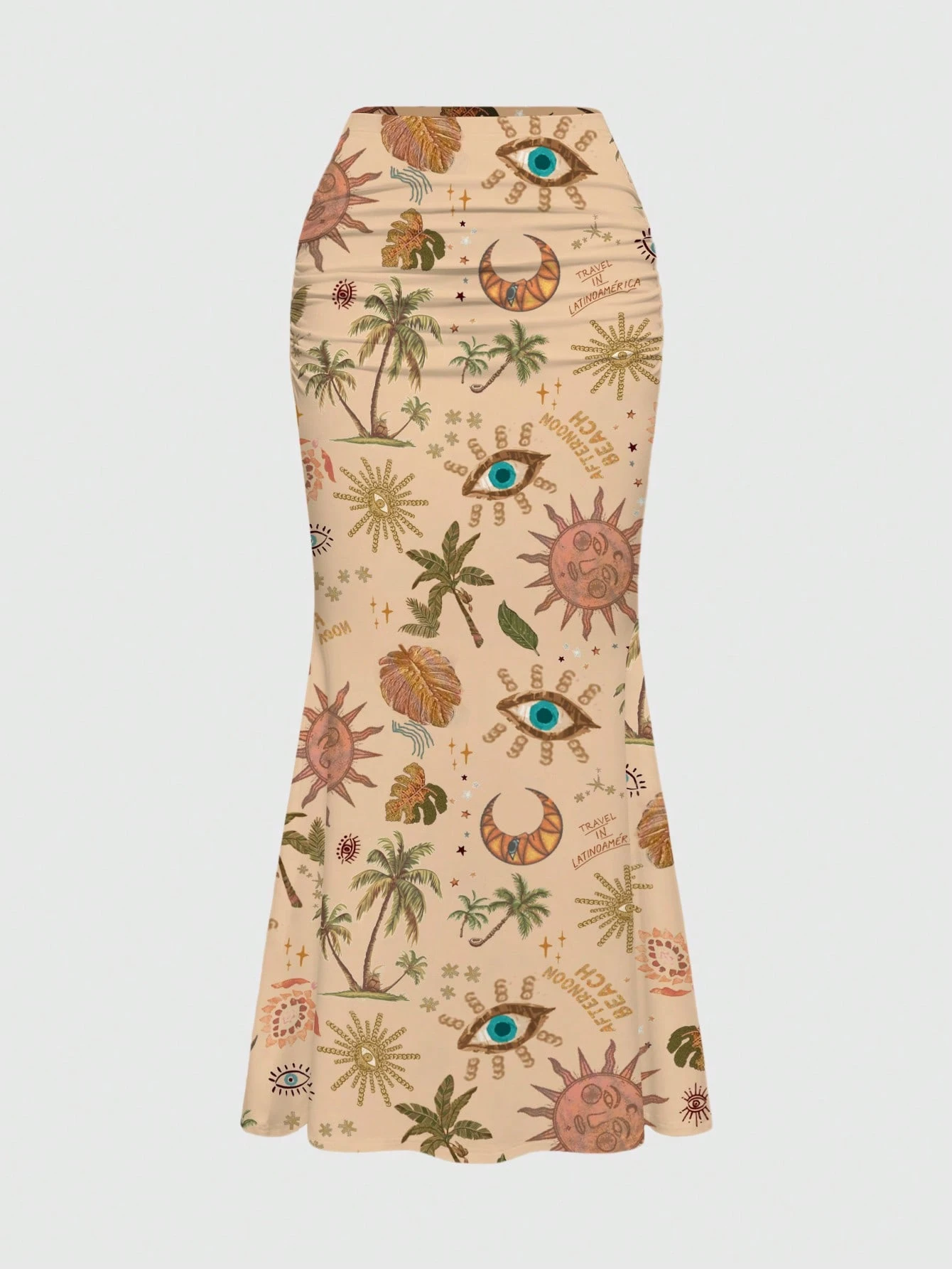 Fairycore Urlaubs-Strandrock für Frauen mit Kokospalme, Sonne, Mond, Stern und Hippie-Slogan Allover-Muster, geraffter Bodycon-Stil mit Meerjungfrau-Saum