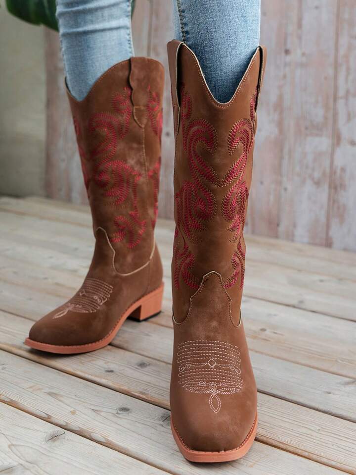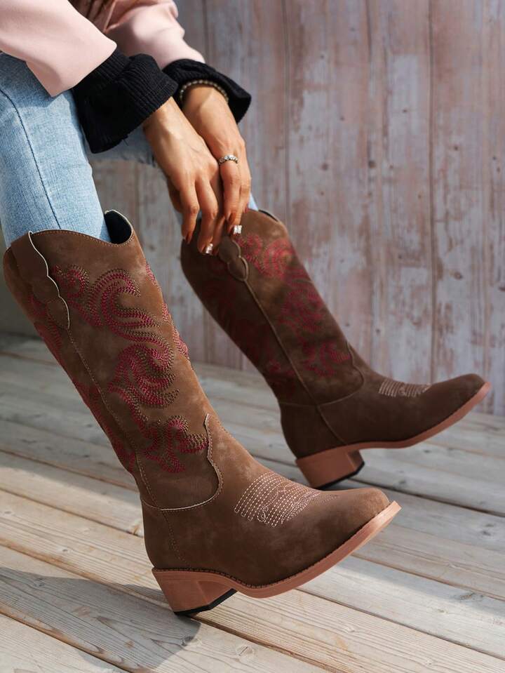 Fairycore Western Style Cowboy Stiefel Mit Klobiger Ferse, V-förmiger Gestickter Knie Hohe Reitstiefel, Retro-stiefel