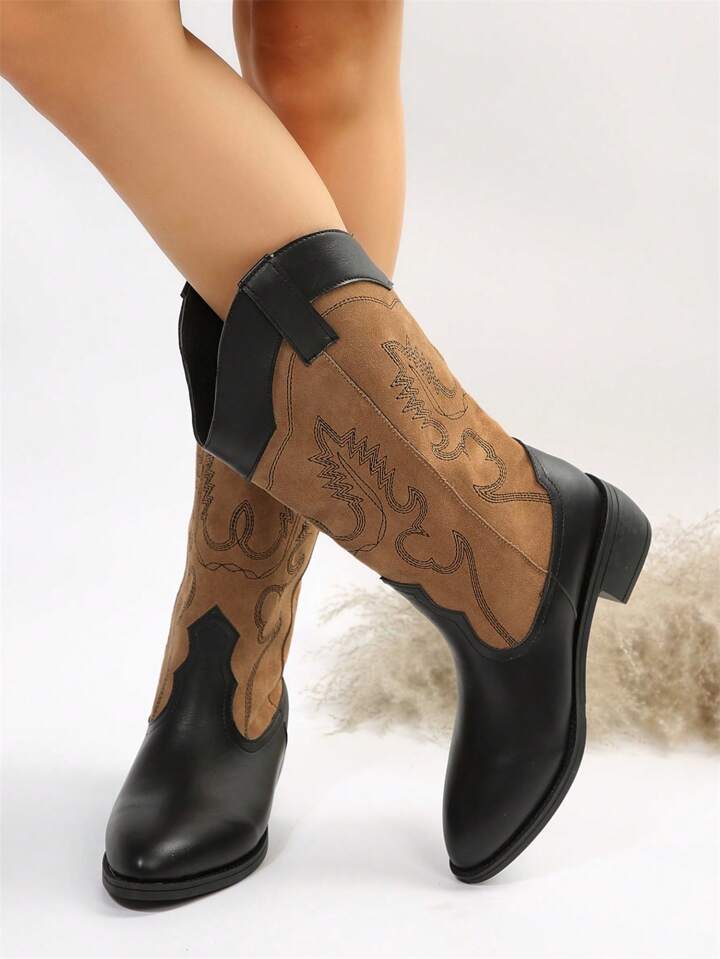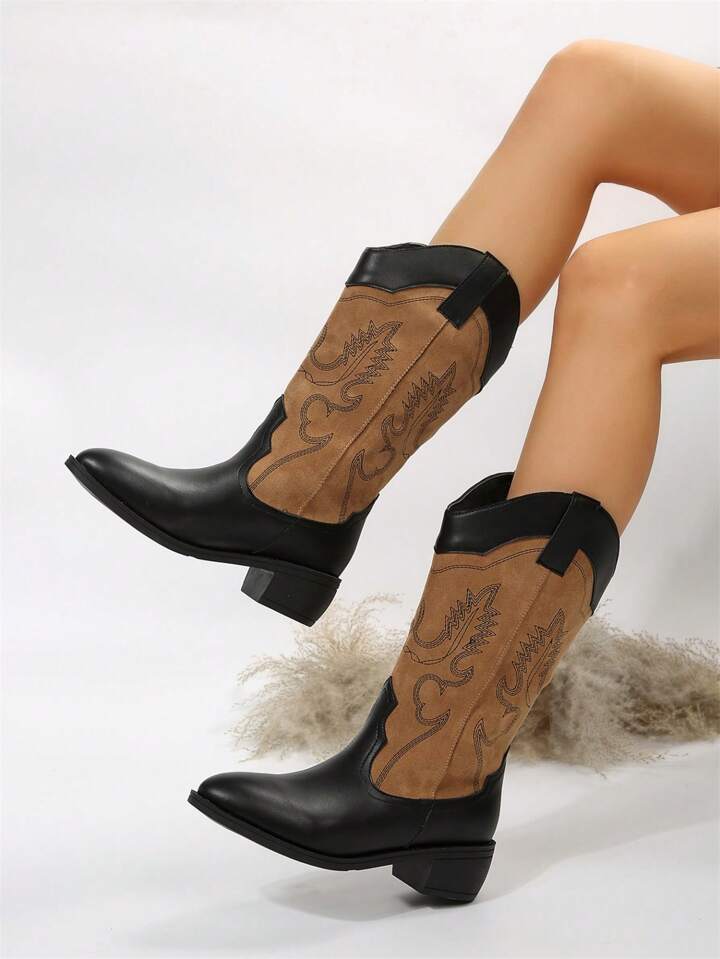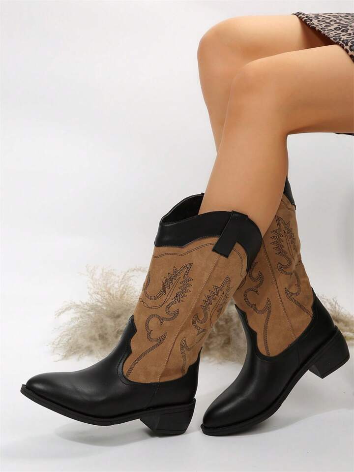 Fairycore Frauen Farbblock Western Stiefel mit Ziernähten, coole Outdoor Mode Stiefel, Cowboy Stiefel für Frauen