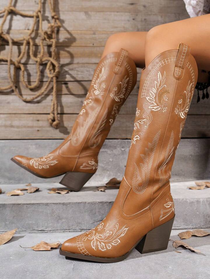 Fairycore Neue Damen Stiefel 2024 mit spitzer Zehenpartie, gesticktem Muster, dicker Absatz und Western Stil für den Außenbereich, Reitstiefel und Kniehohe Stiefel in Mode