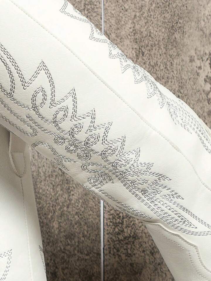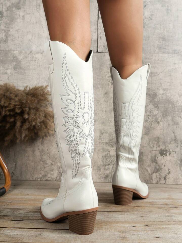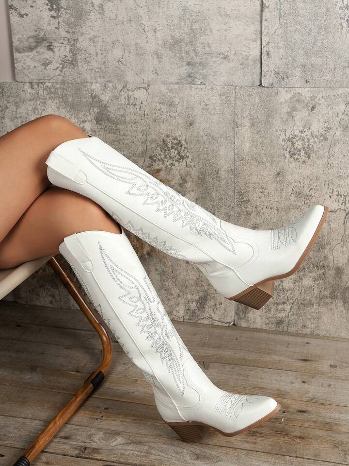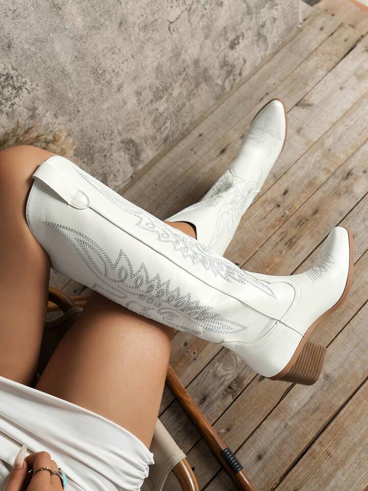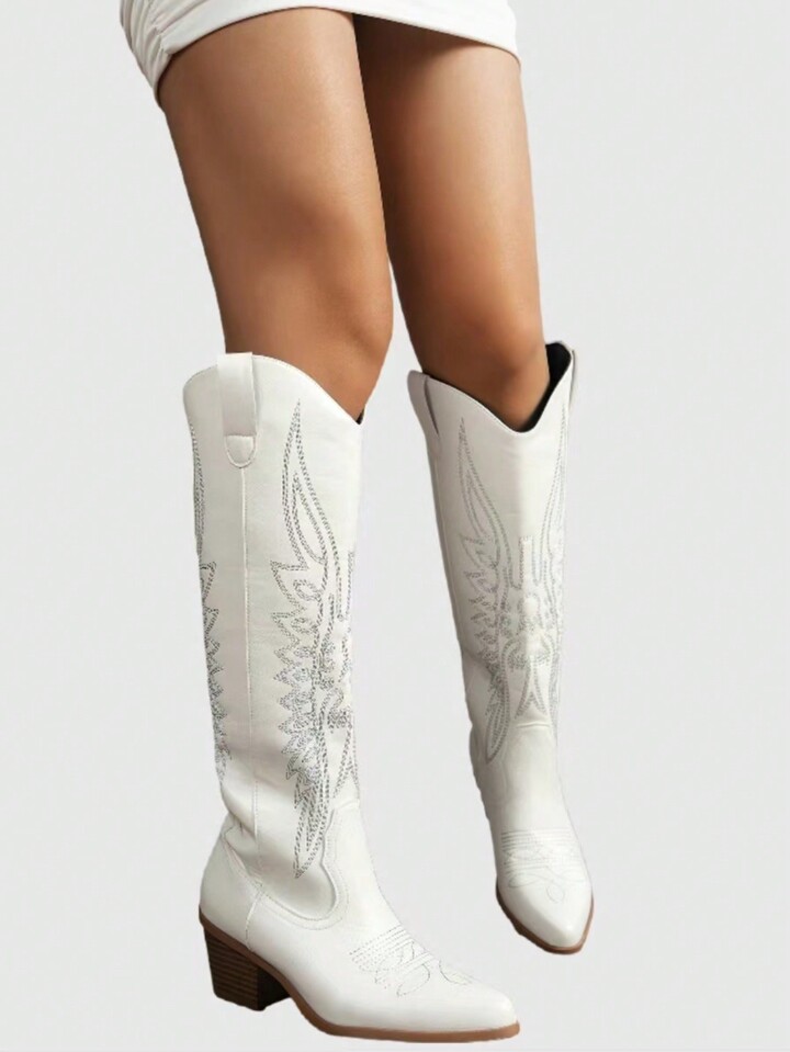 Fairycore 2024 Neue Frühlings-/Herbstmode Damen weiße Western-Kniehochstiefel mit spitzer Zehenpartie, dickem Absatz und Stickereidetails