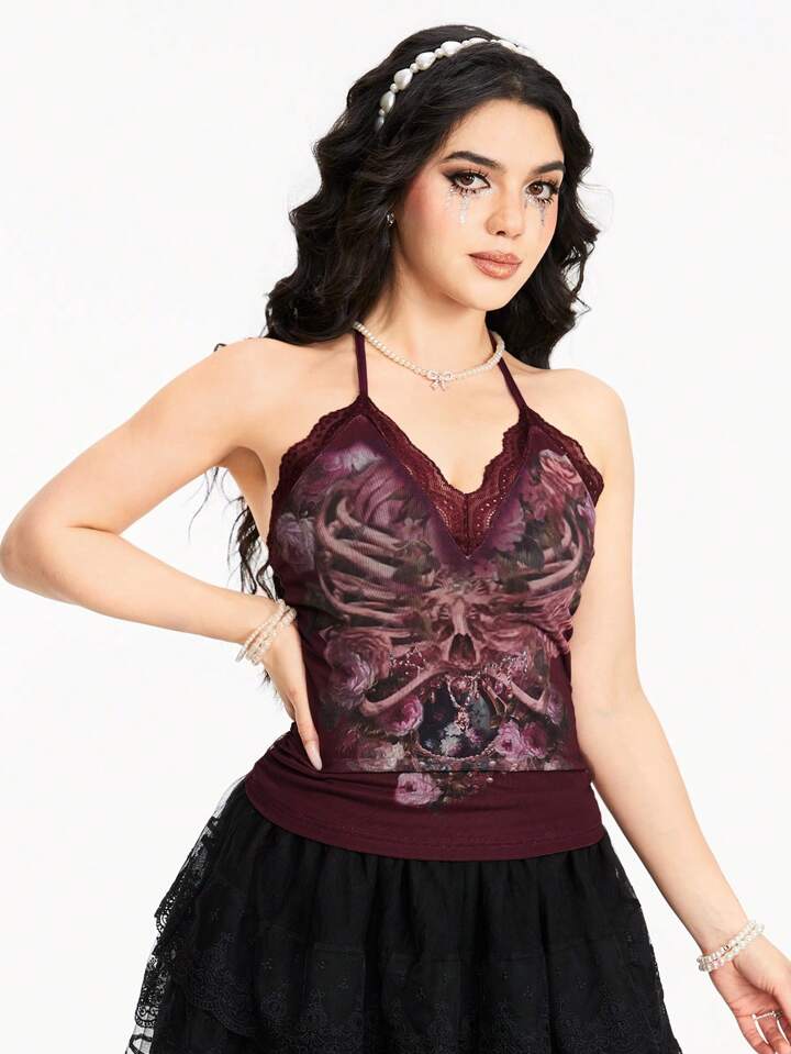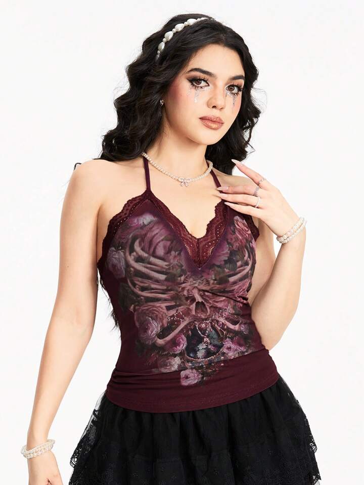 Fairycore Blumen bedrucktes Spitzen-Patchwork Sommer Tank Top für Frauen