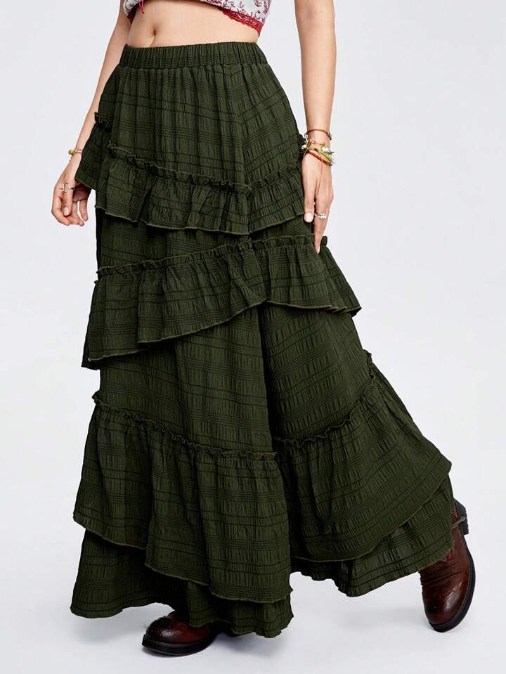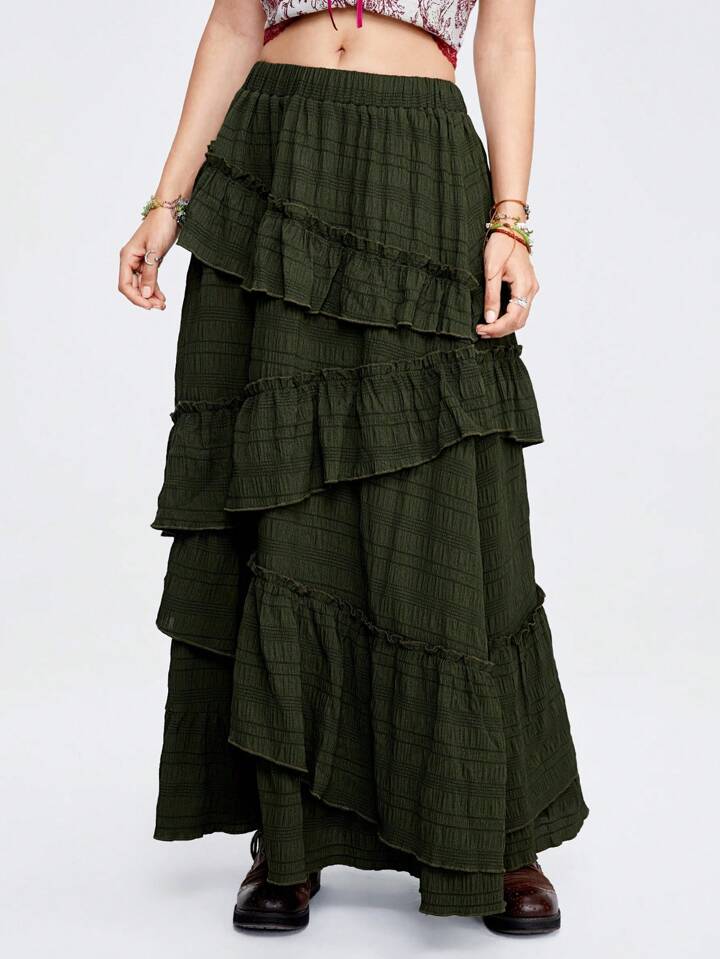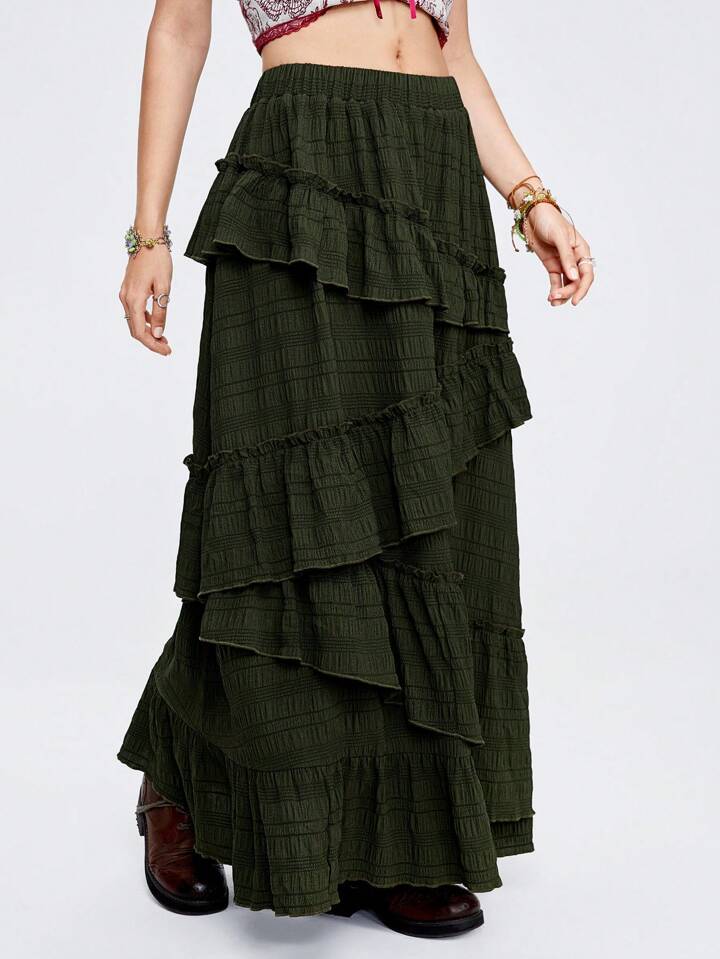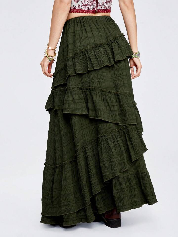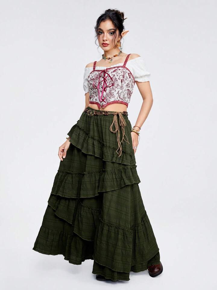 Fairycore Damen Hohe-Taillen-Flowy-Rock, grüner Military Texturstoff mit Rüschen Saum
