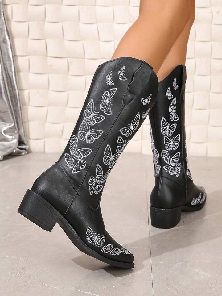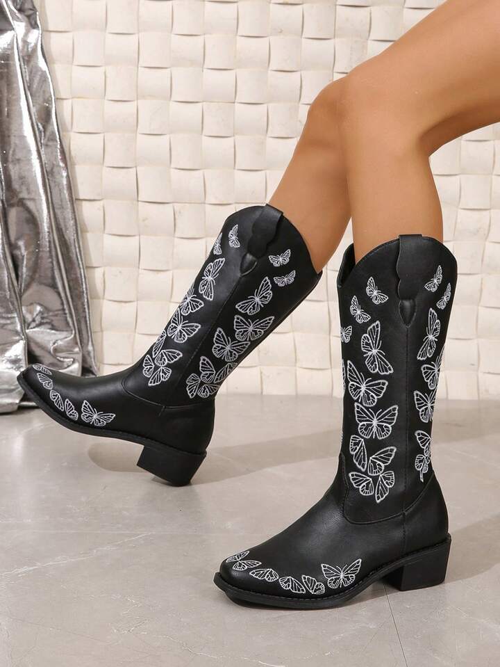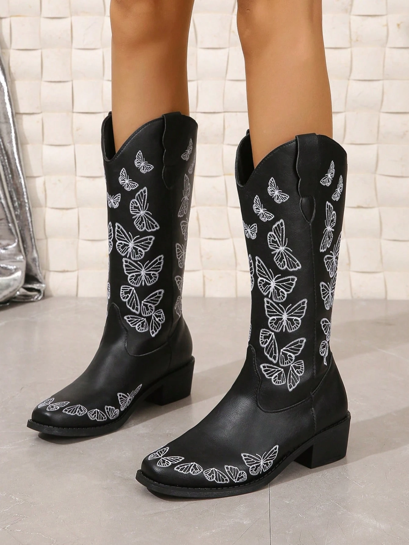 Fairycore Frauen Wade Stiefel 2023 Neue Vintage Stickerei Stiefel Mit Dickem Absatz Westliche Cowboy Stiefel Für Den Herbst