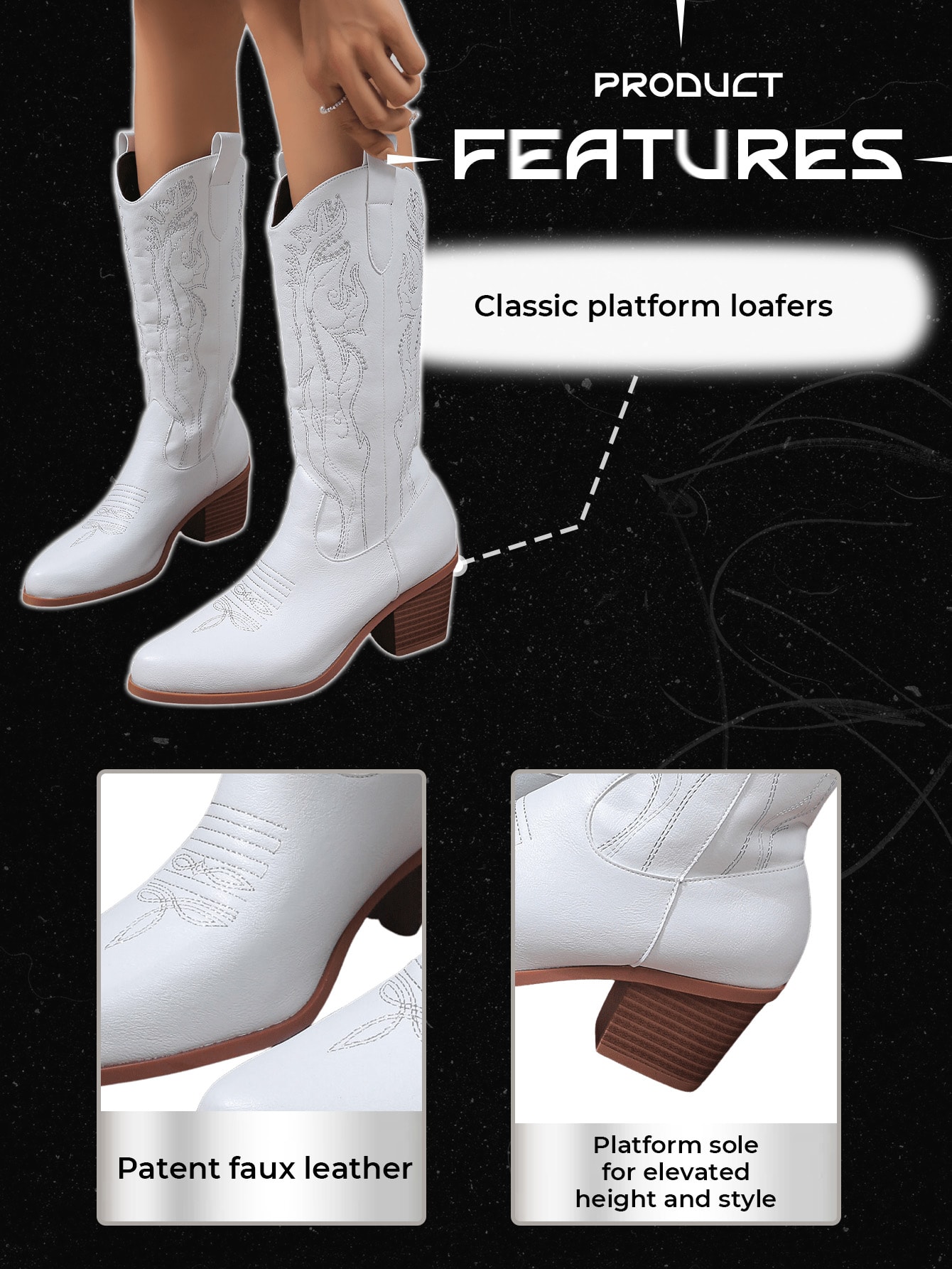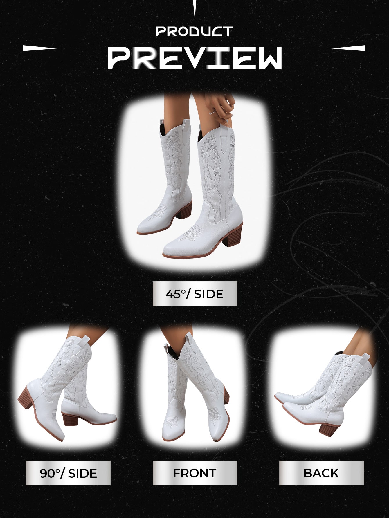 Fairycore Damen weiße spitz zulaufende gestickte Western Cowboy Stiefel, Schlupfstiefel, Frühling/Herbst