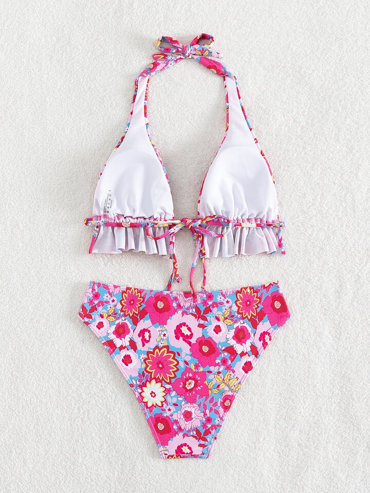 Blumen Muster Bikini Set zum Binden vorne mit Rüschenbesatz, Halter BH & Bikini Unterteil, 2 teiliger Badeanzug