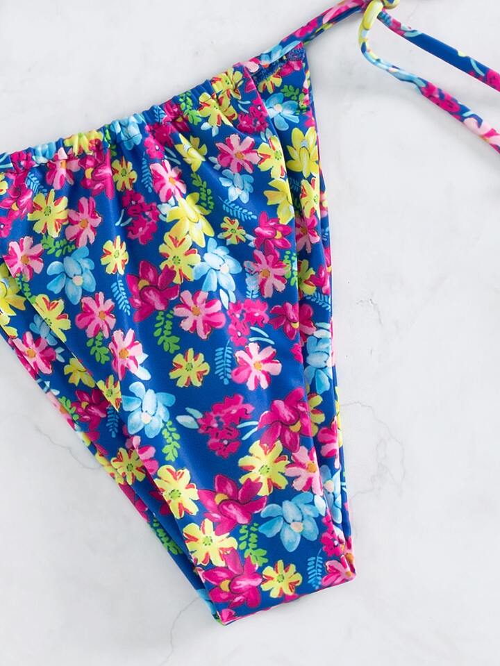 Bikini-Set für den Sommer am Strand mit Blumenmuster, Rüschen und Bandeau-Oberteil