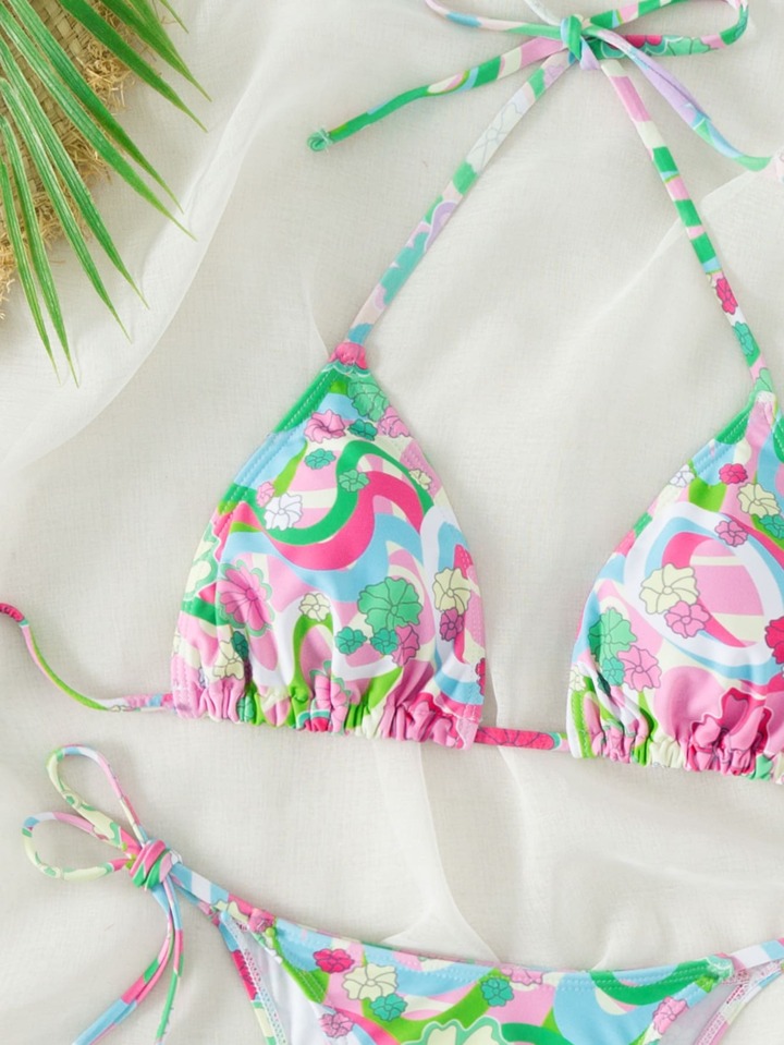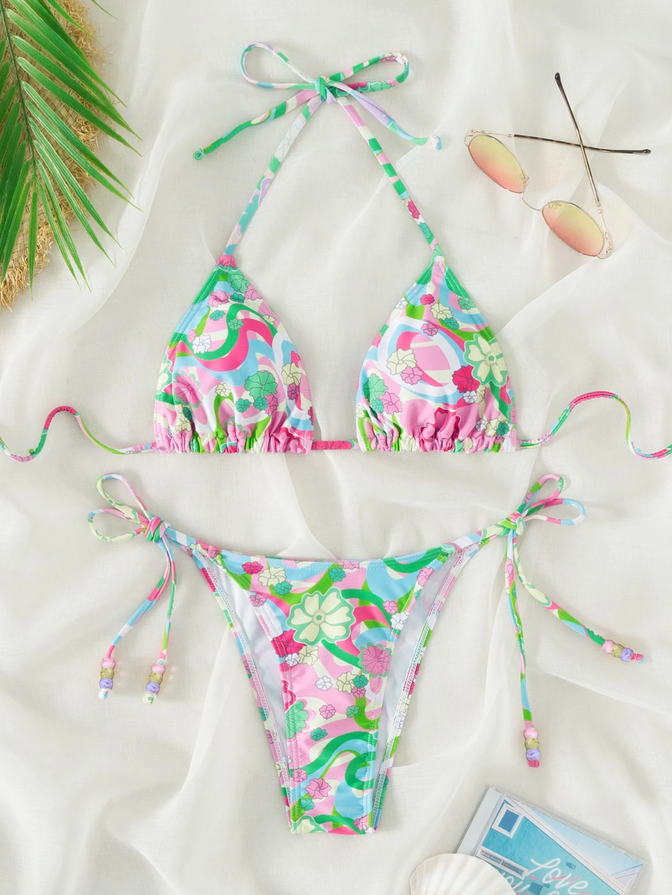 Bikini-Set für den Sommer mit floral bedrucktem Halfter und dreieckigem Slip für den Strand