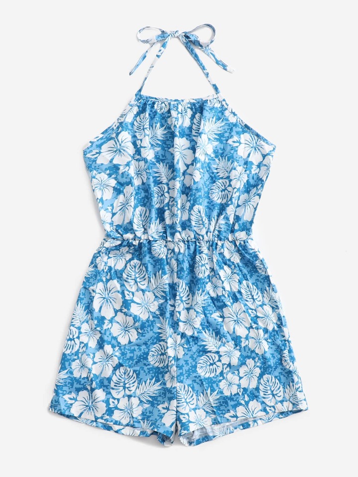 Romper mit Neckholder, Blume & Tropen Muster, Kreuzgurt auf Rücken