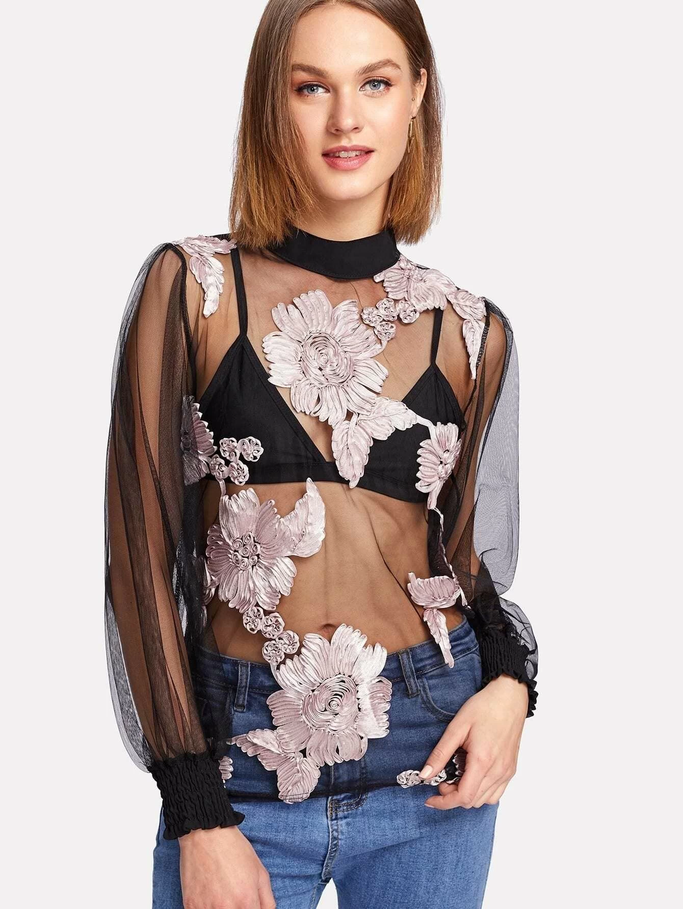 Schwarz Stickerei Geblümt Sexy Blusen