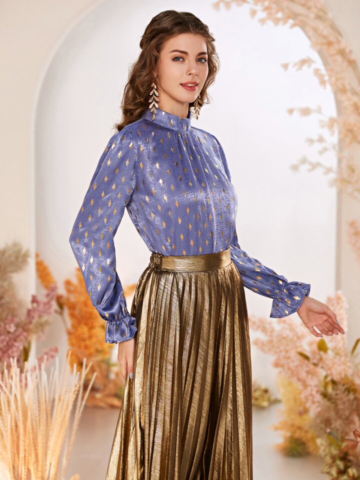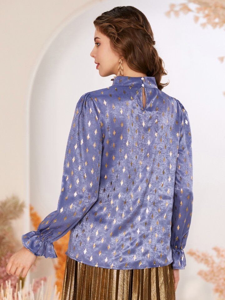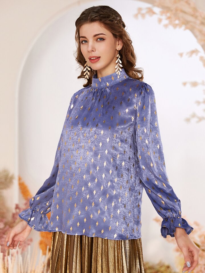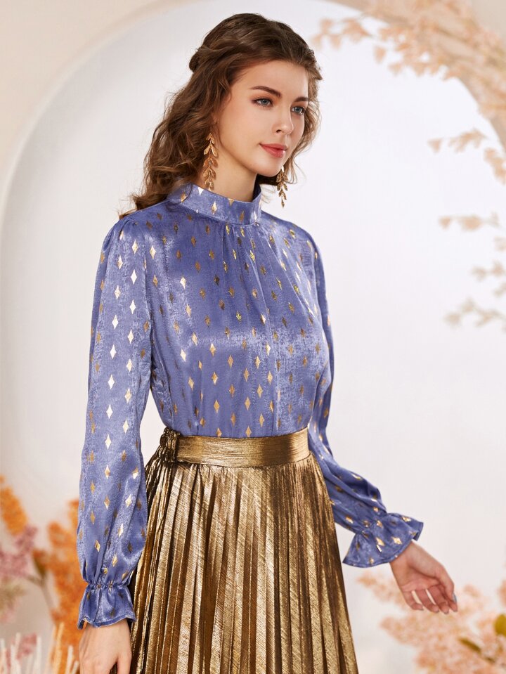 Satin Bluse mit Vergoldung Muster und Stehkragen