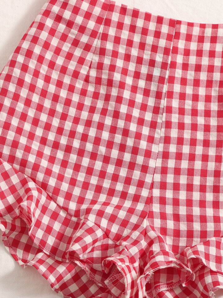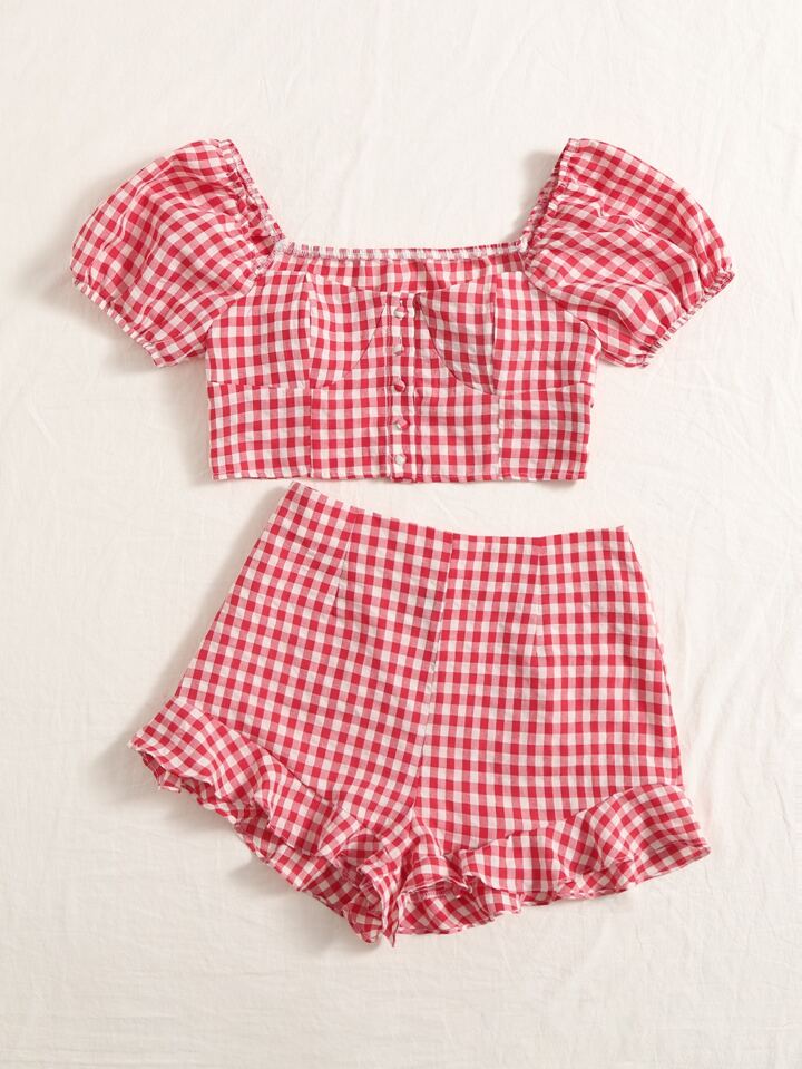 Top mit Gingham Muster, Puffärmeln & Shorts Set mit Rüschen