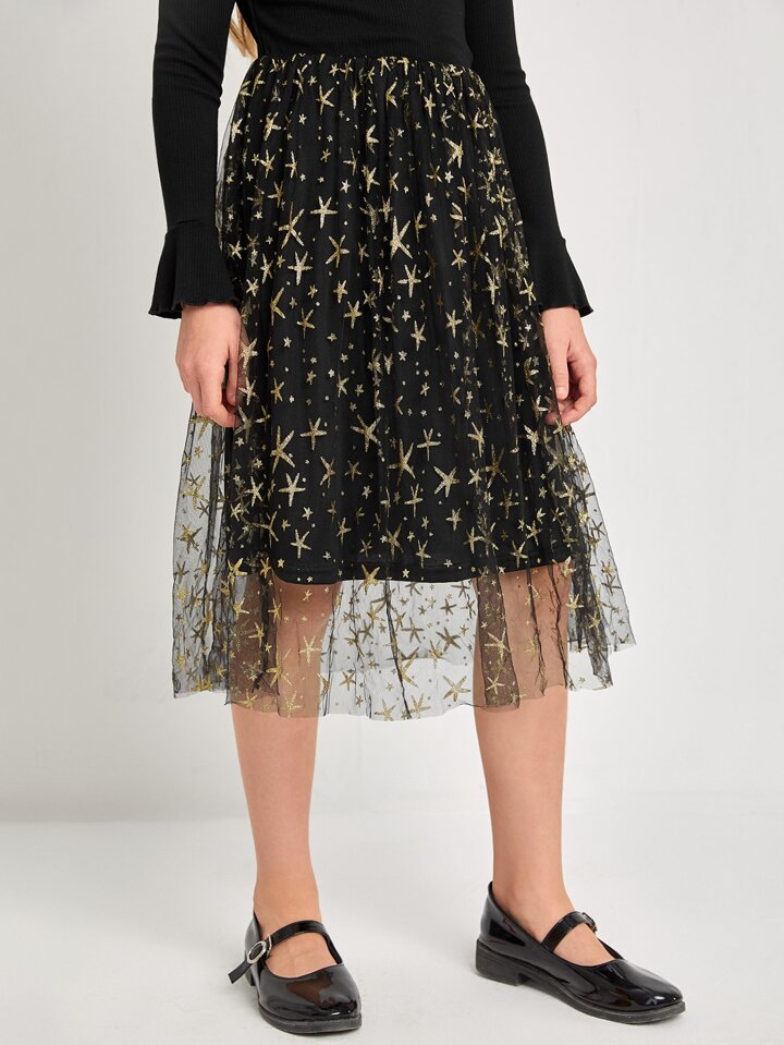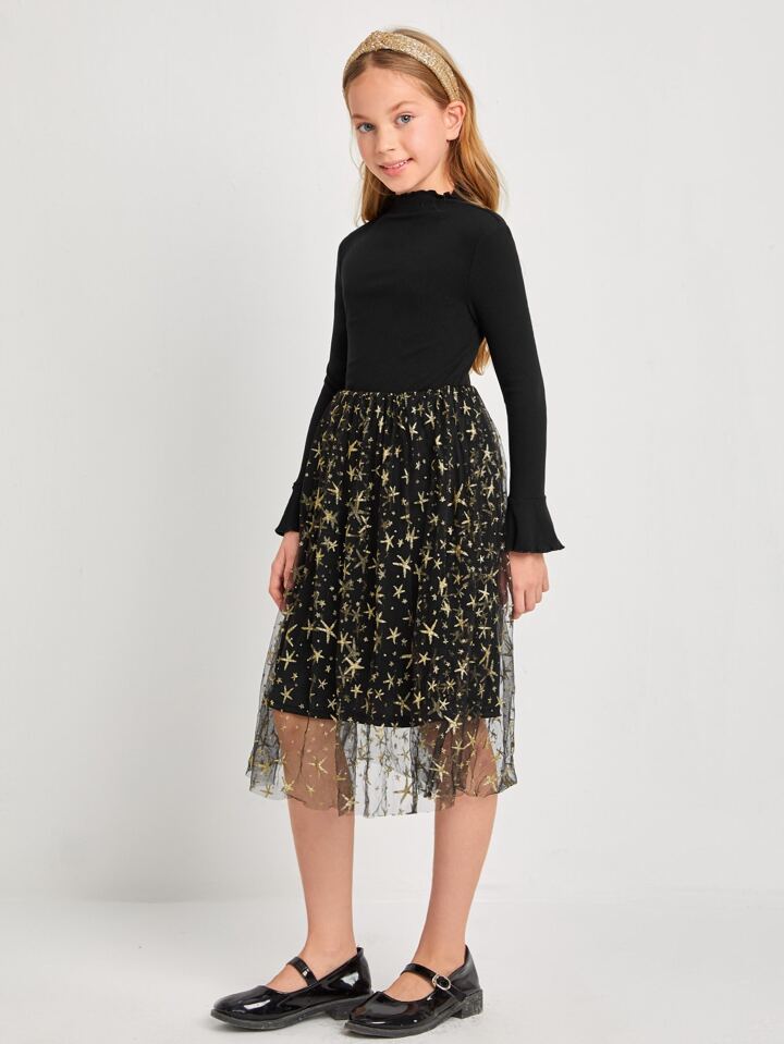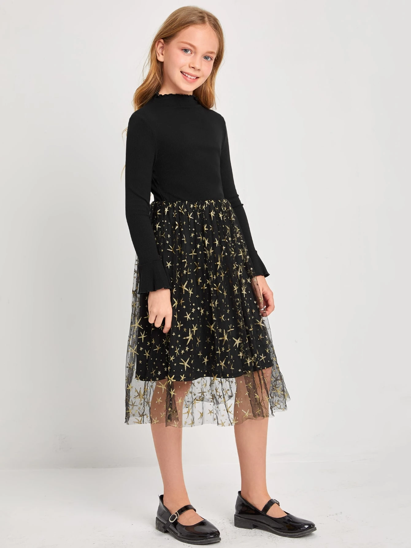 Kleid mit Schößchenärmeln, Galaxie Muster und Mesh-Saum