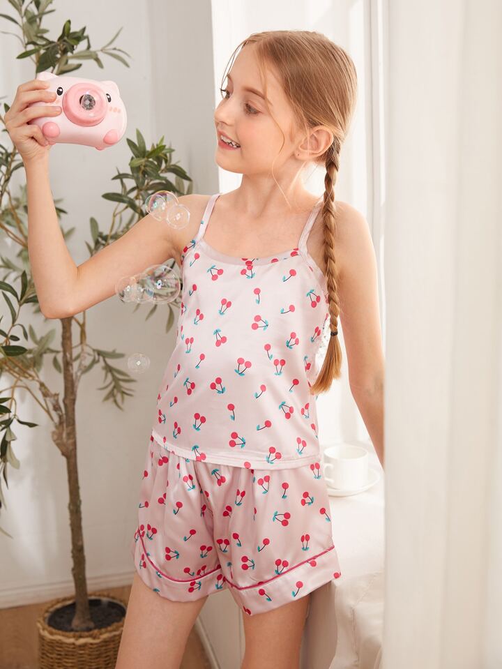 Satin Cami Schlafanzug Set mit Kirschen Muster