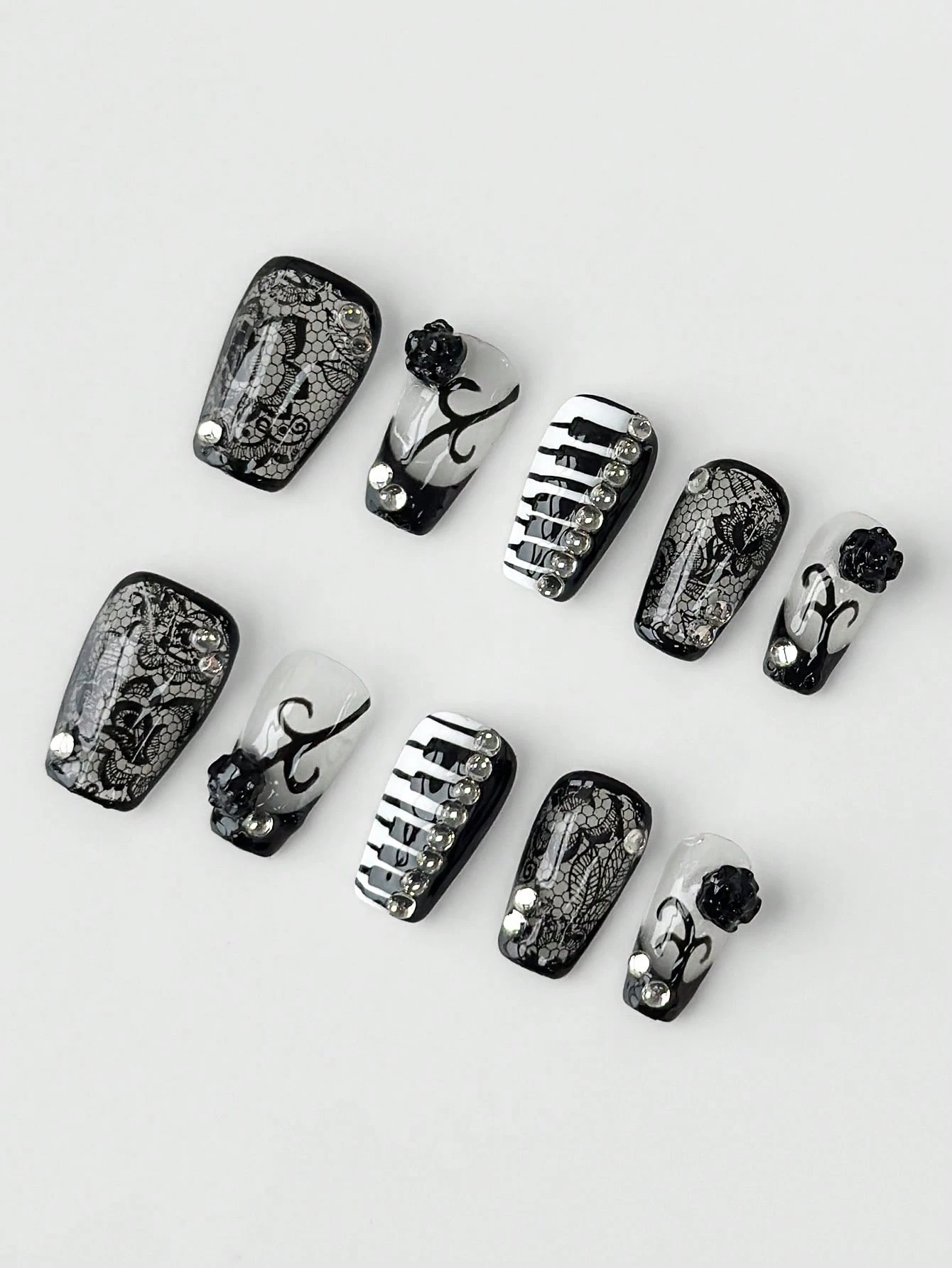 Goth 10 Stücke Y2K-Stil handbemalte schwarze Spitzen-Kunstnägel + 3 Stücke doppelseitiges Klebeband, Hot-Girl-Stil schwarze und weiße Klaviertasten und Rosen abnehmbare mittel- und langfristige Sarg-förmige handgefertigte Aufklebe-Nägel, geeignet für Festivals in allen Jahreszeiten, Tanzveranstaltungen und den täglichen Gebrauch