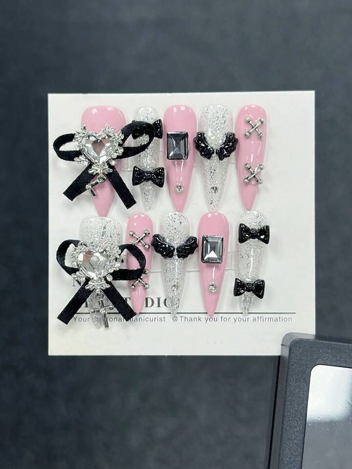 Goth 10 Stücke Nagel Aufkleber Mit Strass Und Schleife Design Und 1 Stück Doppelseitiges Klebeband