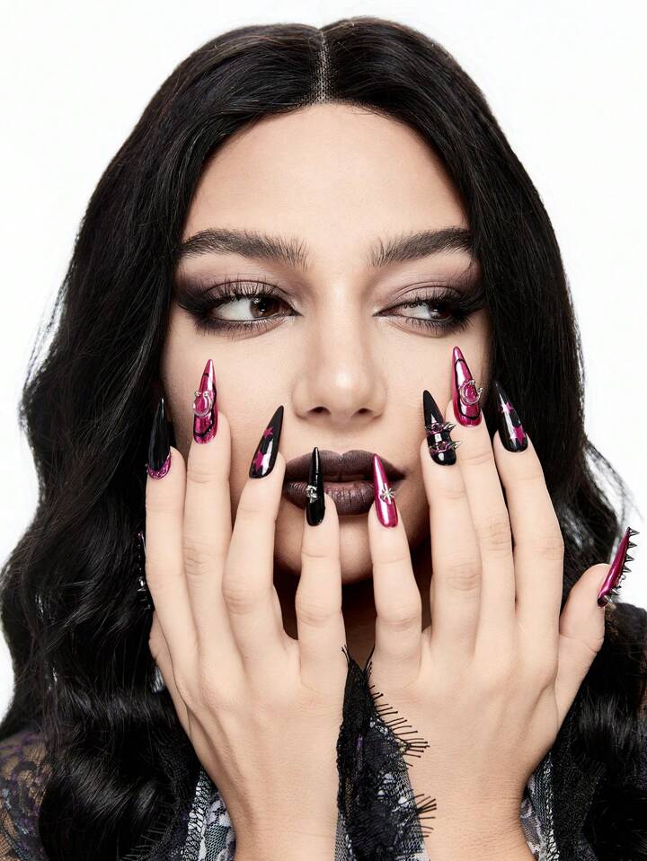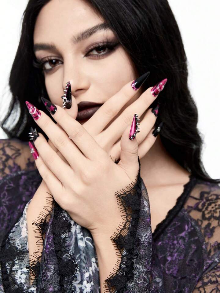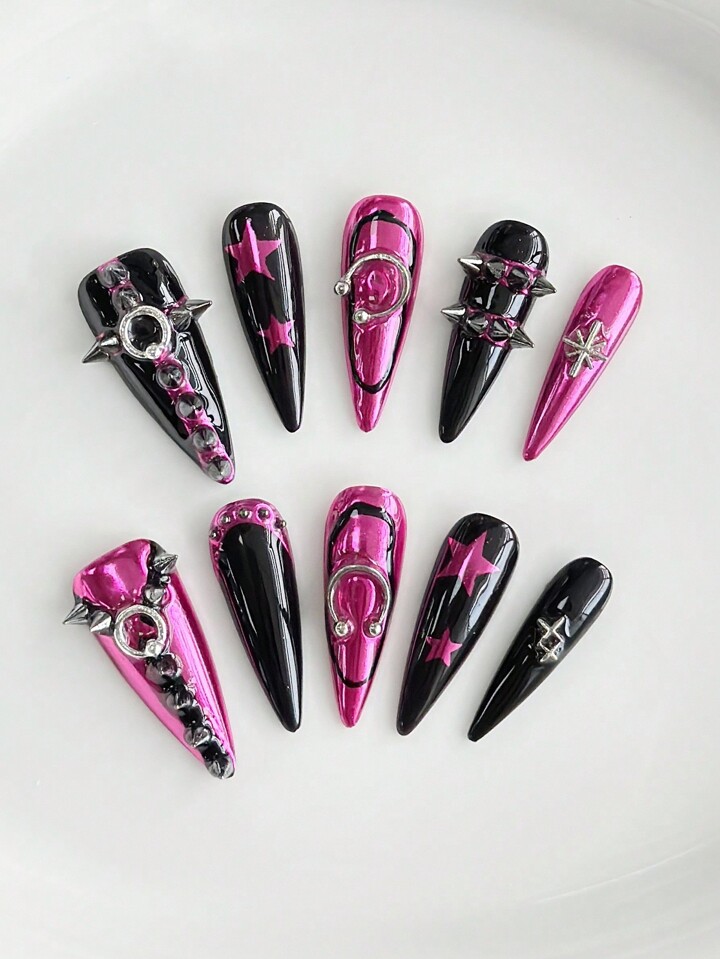 Goth 10 Stücke Punk Stil Nieten Halloween Künstliche Nägel + 3 Stück doppelseitiger Kleber, Metallic Cyber Y2K Stern Nail Art Sticker, abnehmbare und wiederverwendbare handgefertigte Nagel Wraps, geeignet für Feiertage, Partys, Tanzen und den täglichen Gebrauch