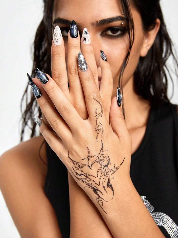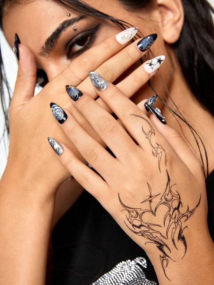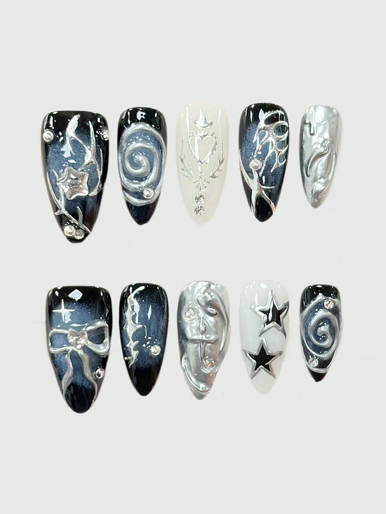Goth 10 Blatt/Set hochwertige schwarze Künstliche Nägel mit 3 Stücke Klebstoff, Metal Punk Y2K Nagelkunst Aufkleber, abnehmbare Dorn Herz Schmetterling Dekoration mit Kunstperlen und Strass asymmetrischen Linien, perfekt für Festivals, Partys, Tanzen und den täglichen Gebrauch.